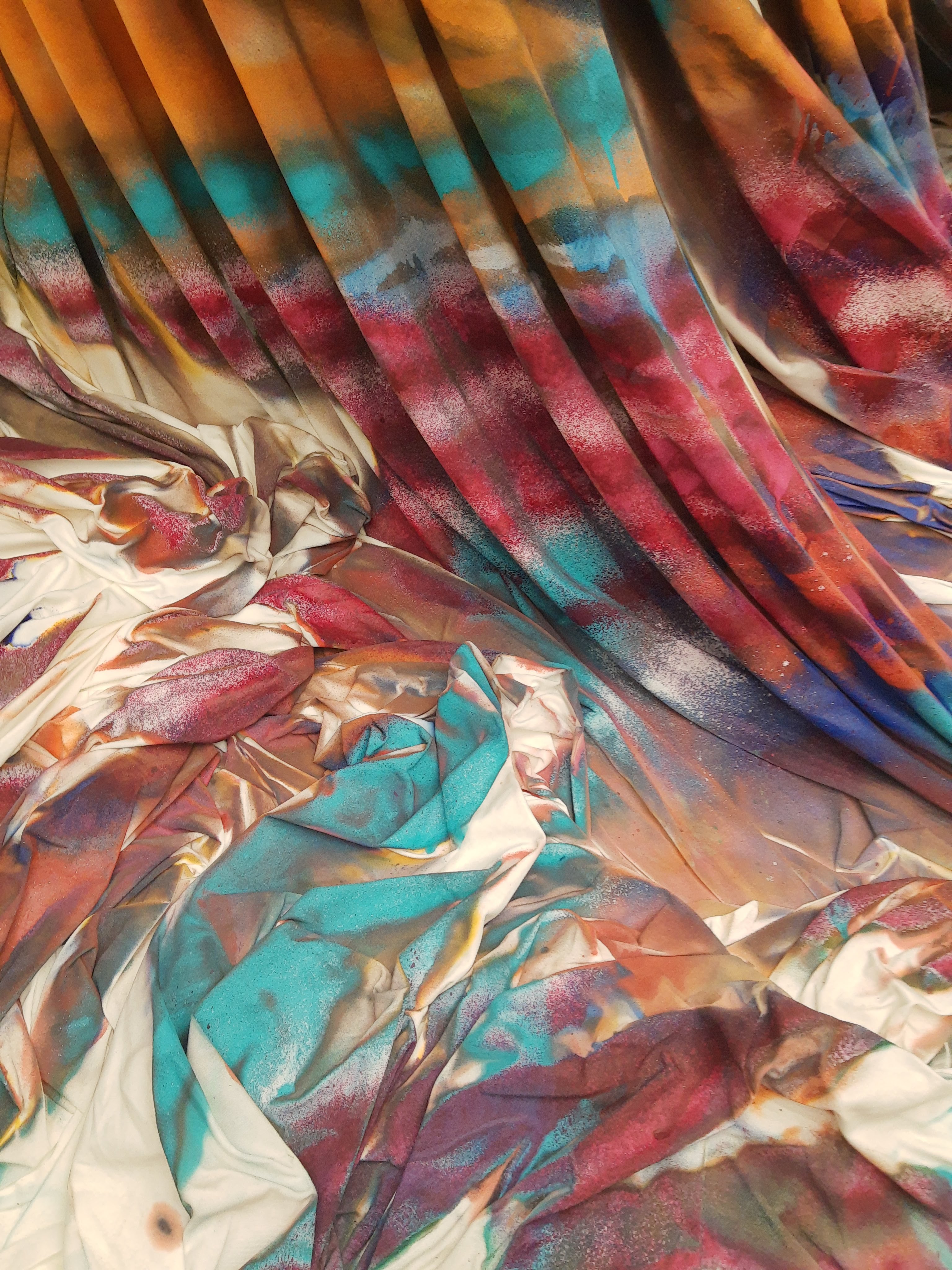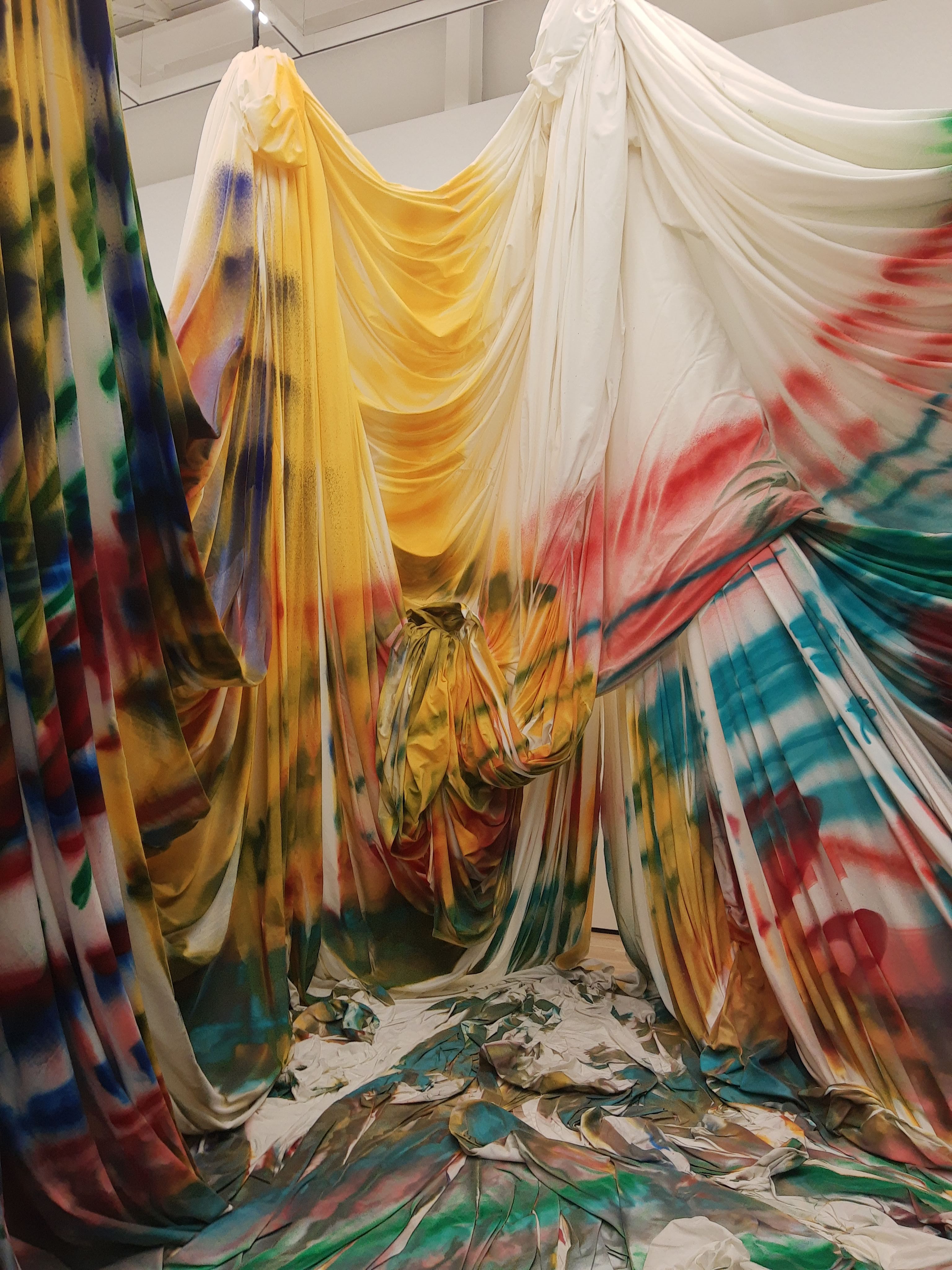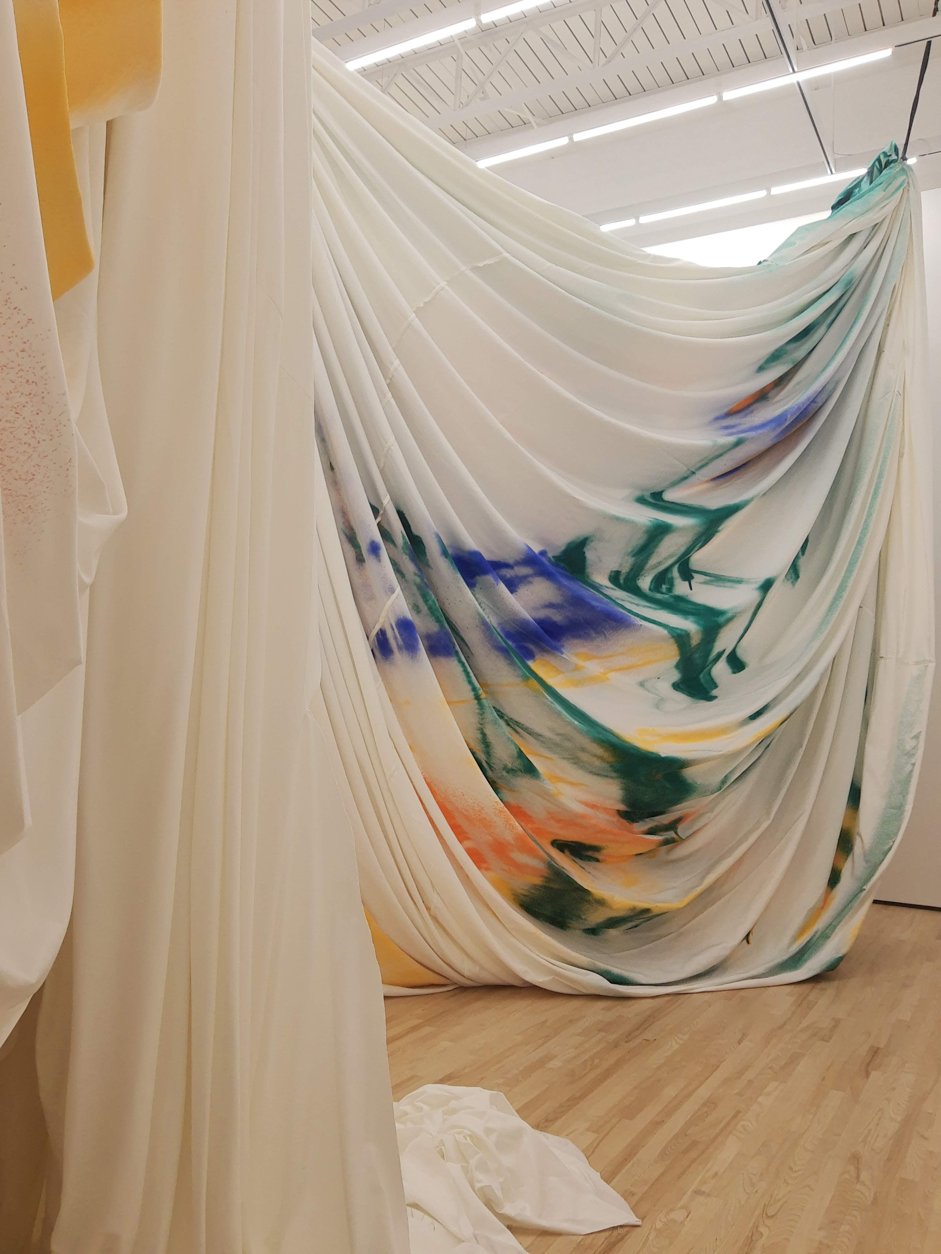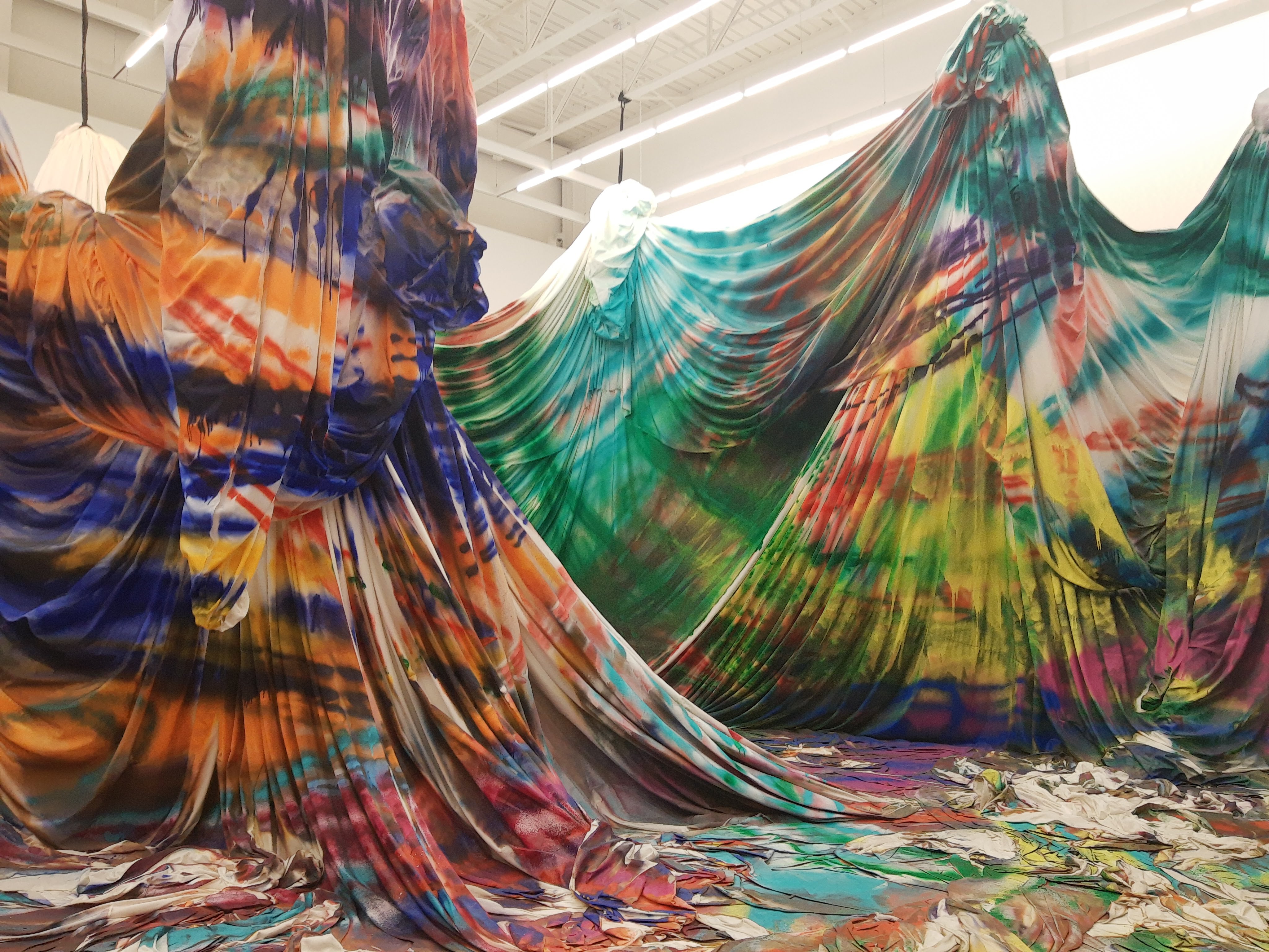 I walked around the outside of the hanging canvases, seeing glimmers of color peeking through. To say it’s massive is an understatement. 50,000 square feet of canvas, suspended and draped from the ceiling to the ground.