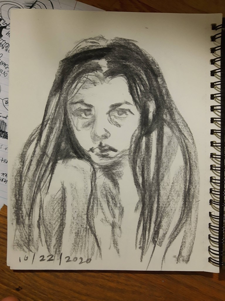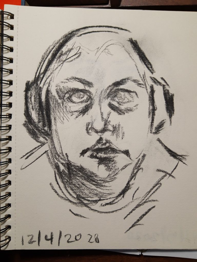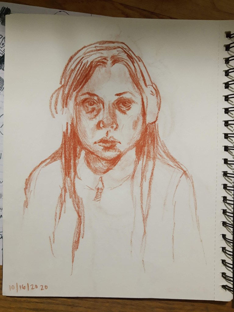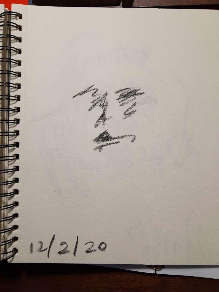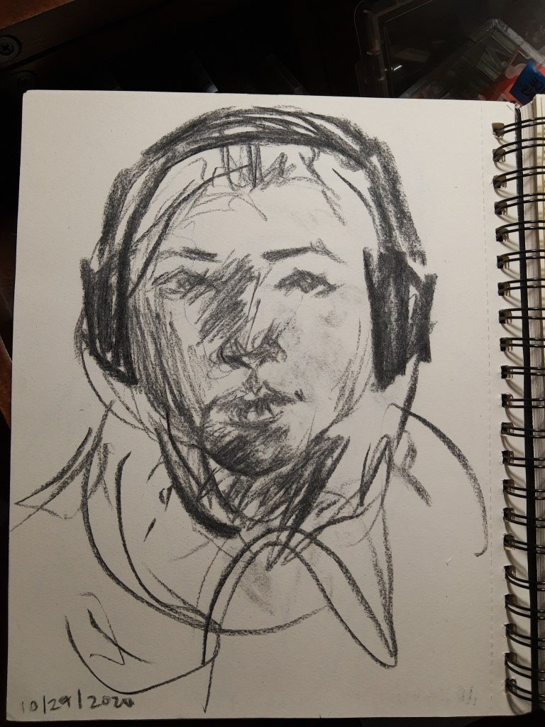 Because I already had an alarm set for 8pm each day, I decided I might as well draw every night when my alarm went off. And I was pretty consistent for a month and a half, and then I stopped. I made myself draw even when I didn’t want to draw. Some drawings are more gestural, some are just a few marks, and some I spent more time on. Some drawings really suck – the eyes are too close or too far from each other, the proportions are off, the nose looks flat and squished. Some drawings I spent 5 seconds on, some I spent an hour on. Some I drew in the dark. When I skipped a few days, I made it up by drawing more than one self-portrait over the next few days. At the end, I was skipping more and more days and I was spending less time on my drawings, so I thought it would be a good place to stop. I’m going to draw myself every day again soon. I want to fill that sketchbook with bad self-portrait drawings. My favorite drawing is the one from 10/22/2020 because I stopped caring about details and focused on shadow and gesture. Here are my daily self-portrait drawings from 10/15/2020 – 12/5/2020: