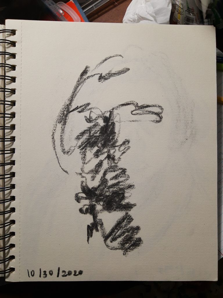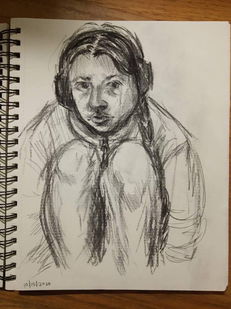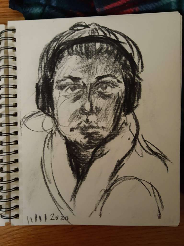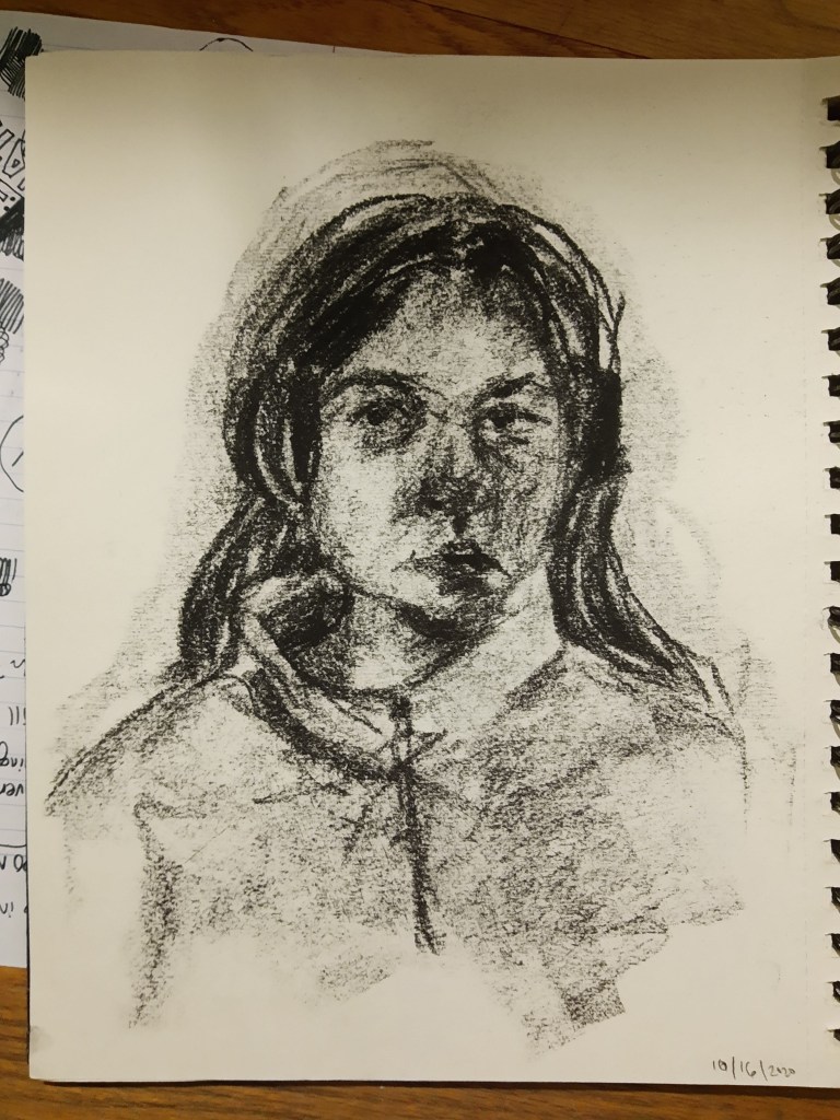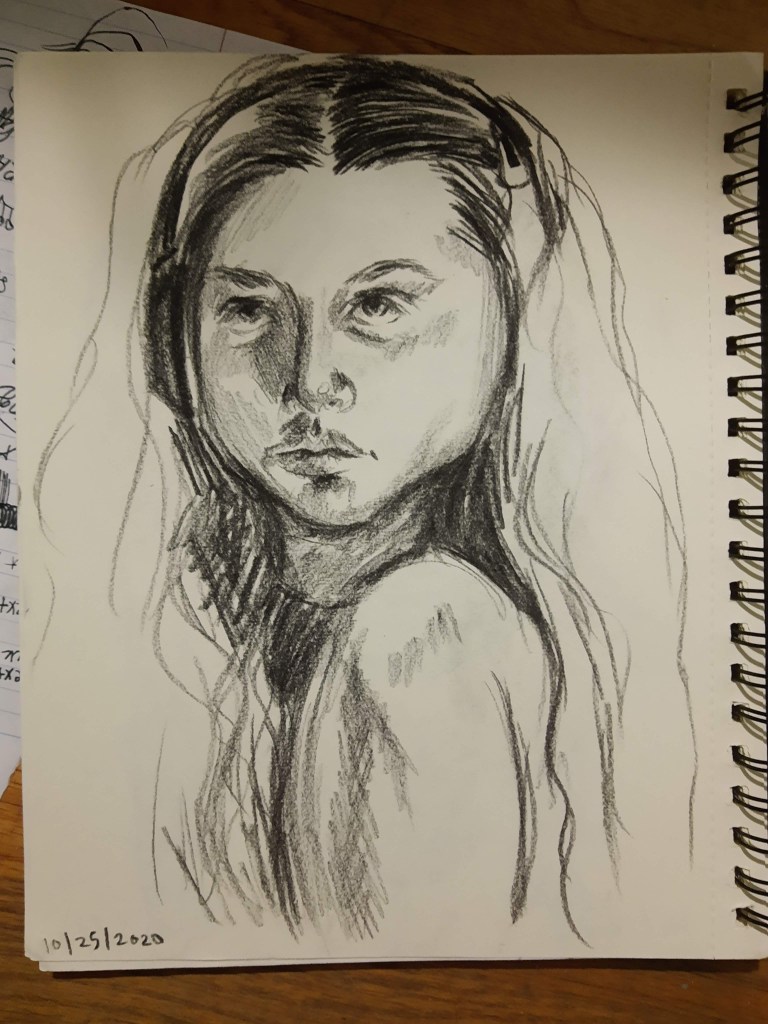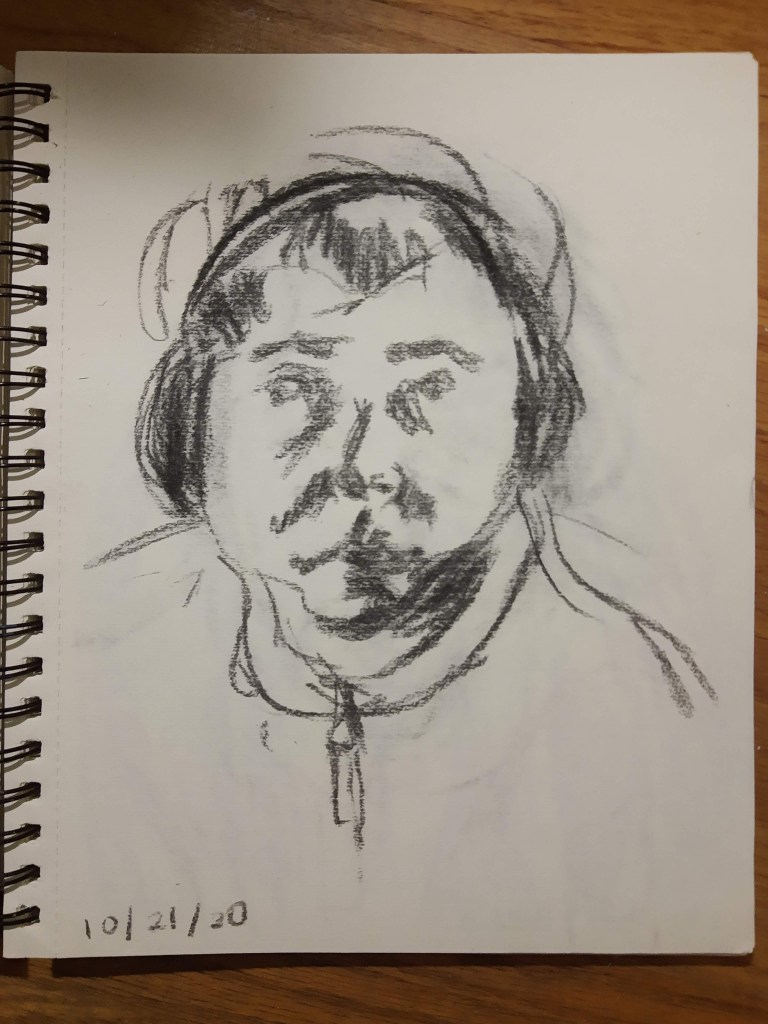 Because I already had an alarm set for 8pm each day, I decided I might as well draw every night when my alarm went off. And I was pretty consistent for a month and a half, and then I stopped. I made myself draw even when I didn’t want to draw. Some drawings are more gestural, some are just a few marks, and some I spent more time on. Some drawings really suck – the eyes are too close or too far from each other, the proportions are off, the nose looks flat and squished. Some drawings I spent 5 seconds on, some I spent an hour on. Some I drew in the dark. When I skipped a few days, I made it up by drawing more than one self-portrait over the next few days. At the end, I was skipping more and more days and I was spending less time on my drawings, so I thought it would be a good place to stop. I’m going to draw myself every day again soon. I want to fill that sketchbook with bad self-portrait drawings. My favorite drawing is the one from 10/22/2020 because I stopped caring about details and focused on shadow and gesture. Here are my daily self-portrait drawings from 10/15/2020 – 12/5/2020:
