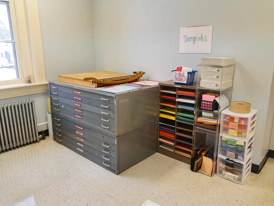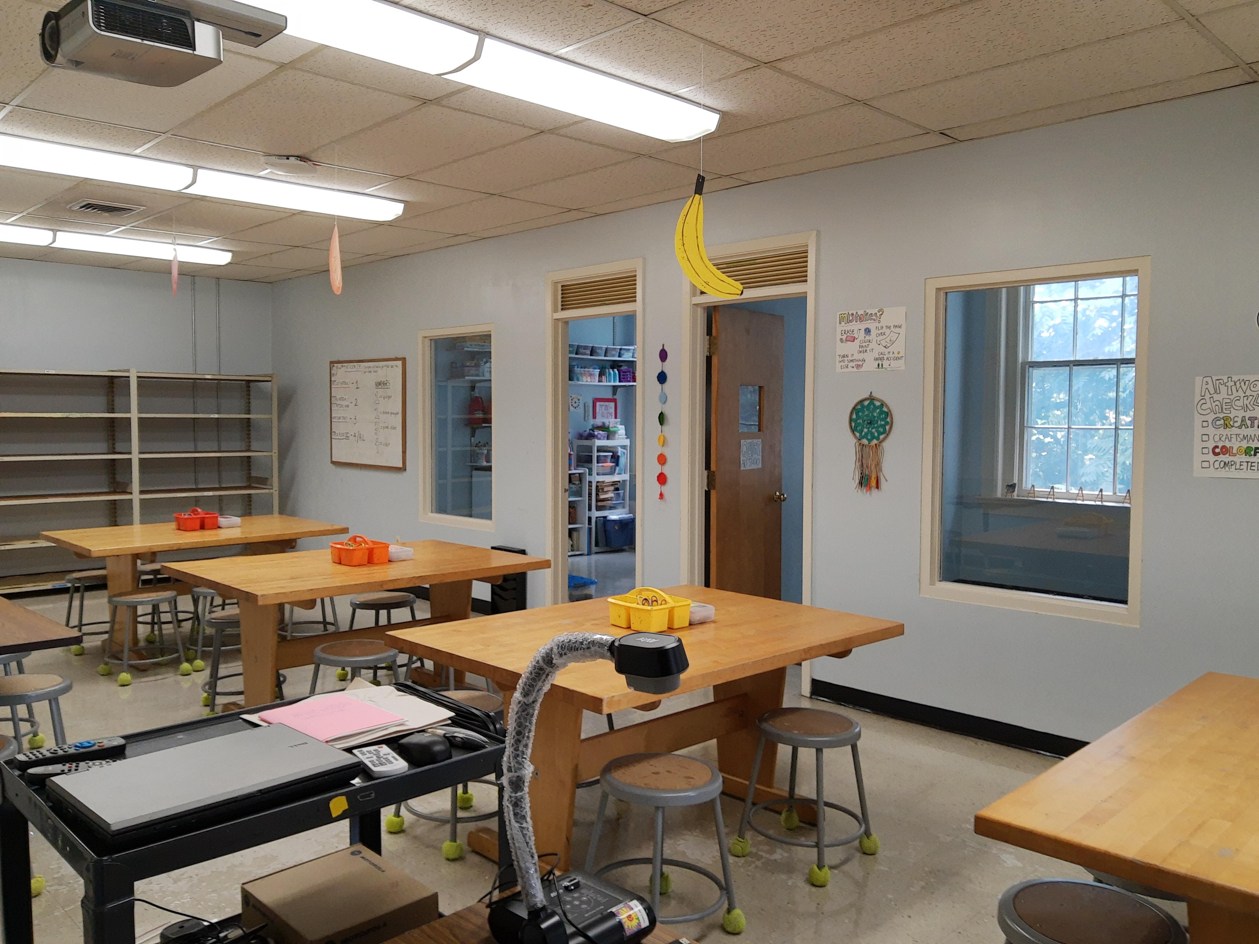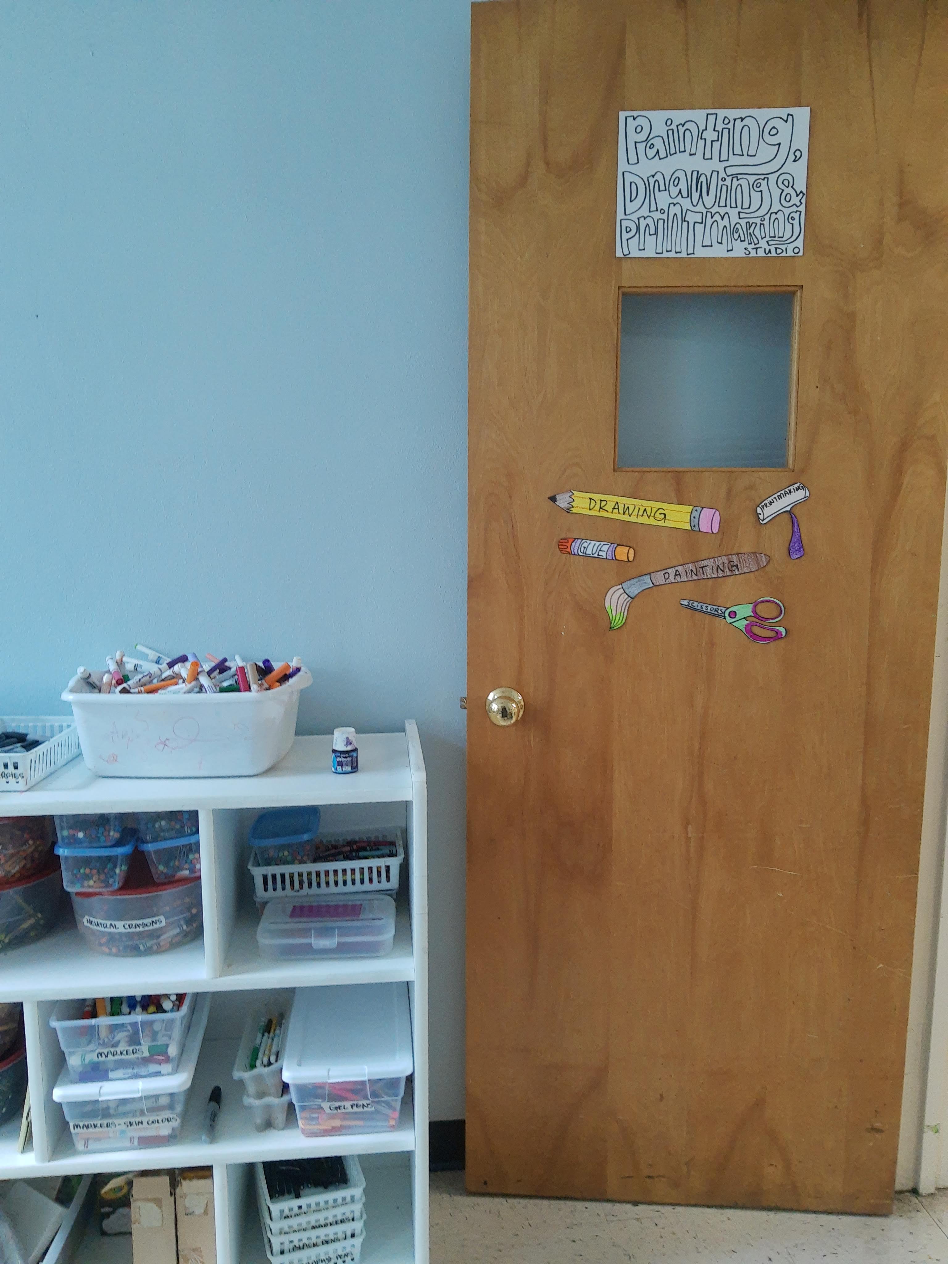 My classroom is comprised of one main room and 4 smaller rooms which I’ve separated into studios (painting/printmaking studio, drawing/early finishers studio, paper/inspiration studio, and 3D/textile studio).