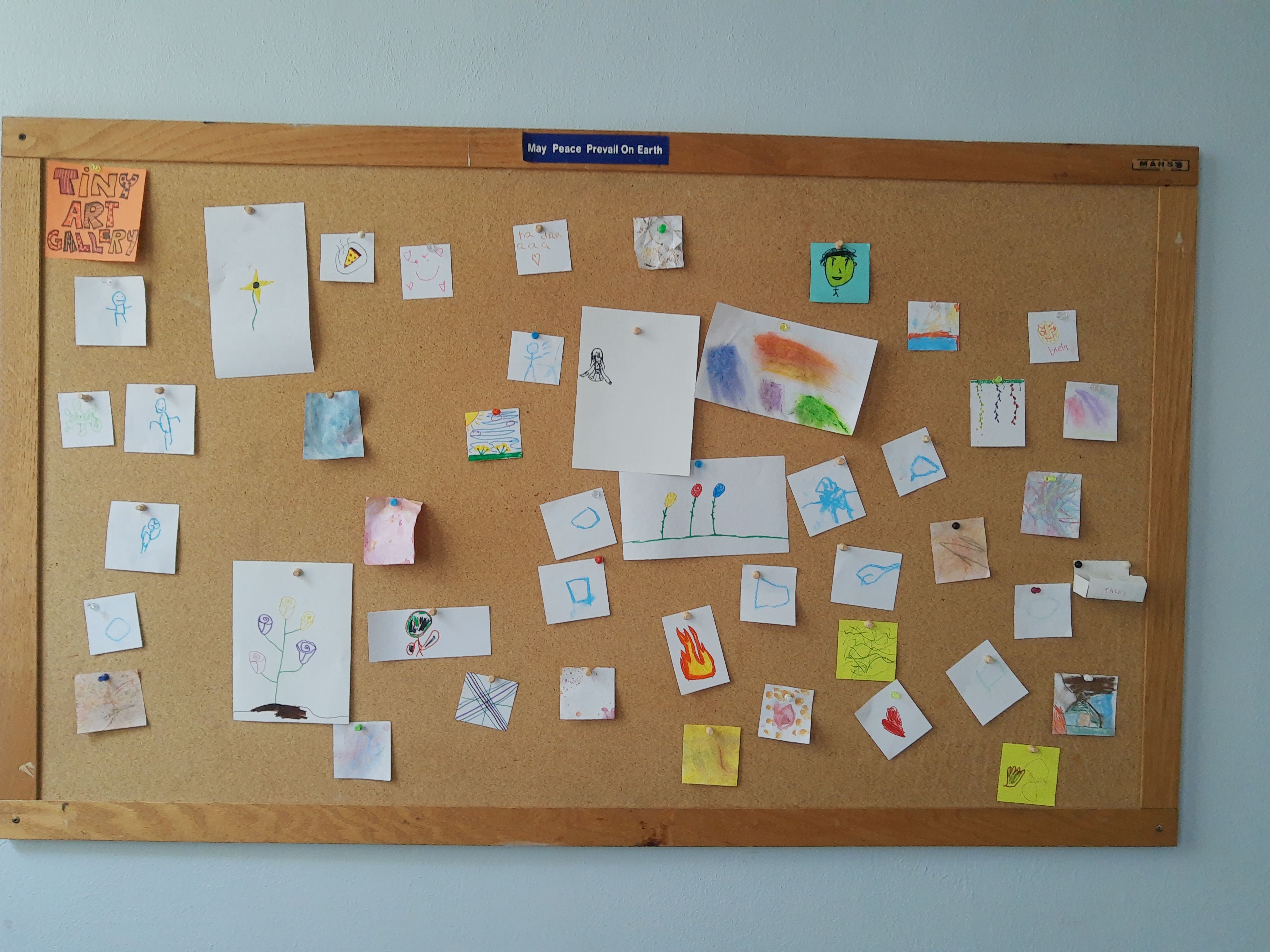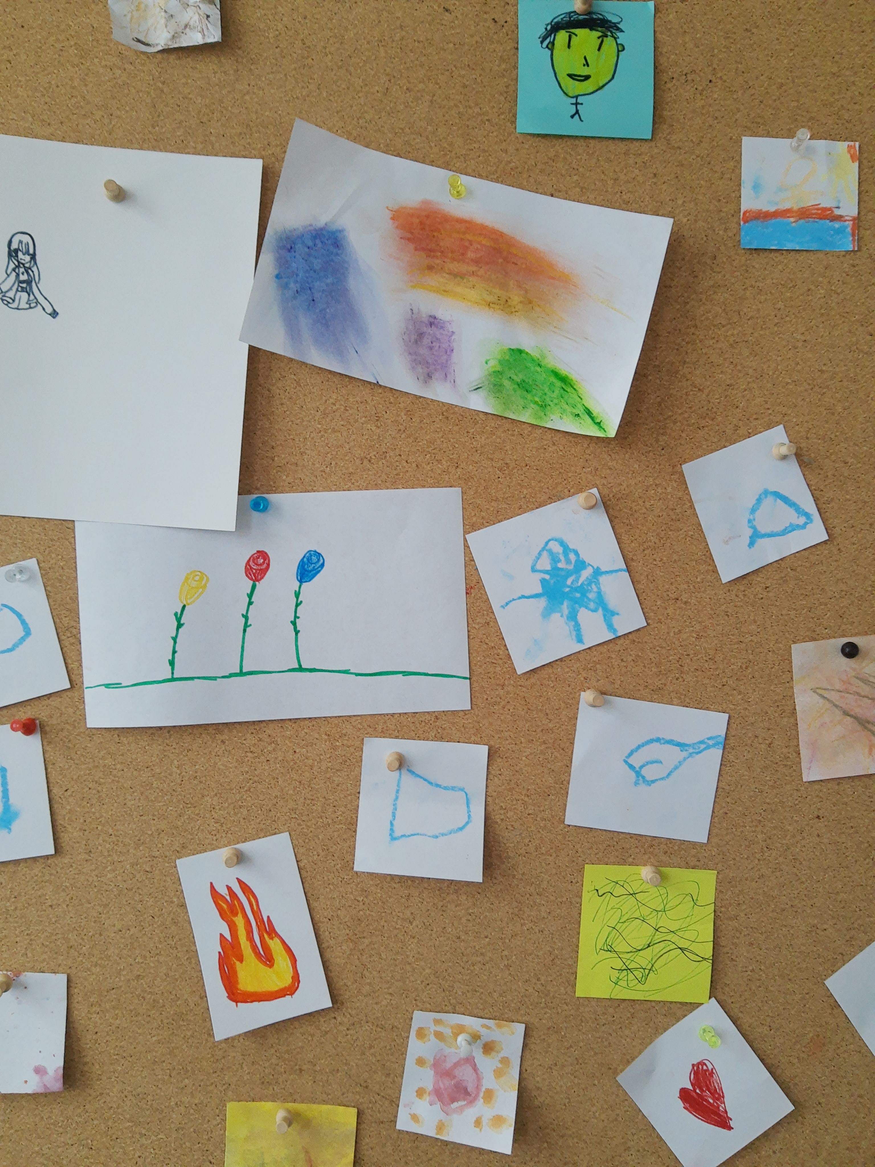 In the drawing studio, students used chalk pastels and oil pastels and experimented with smudging and drawing different things. When they finished their tiny artwork, they pinned it up on the board.