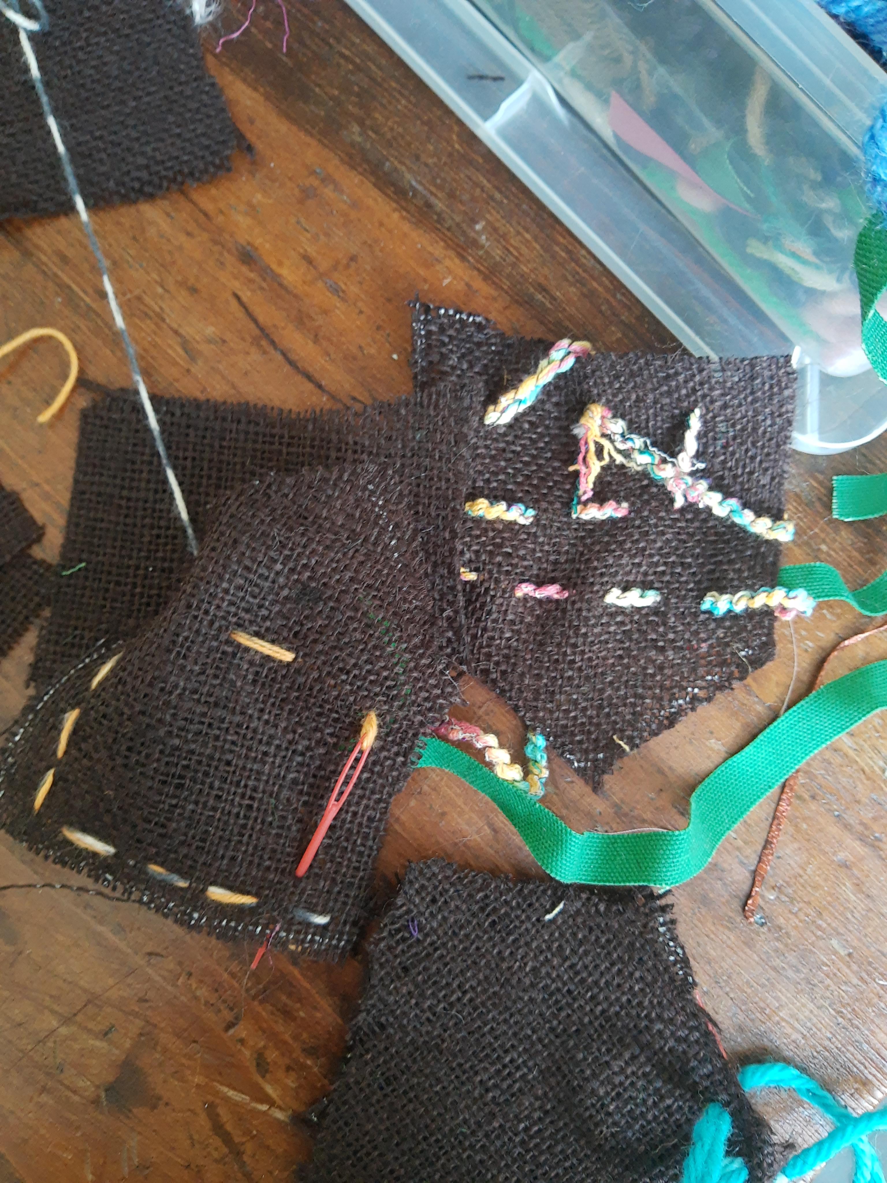 In the 3D/textile studio, students experimented with sewing lines into fabric and sculpting with modeling clay.