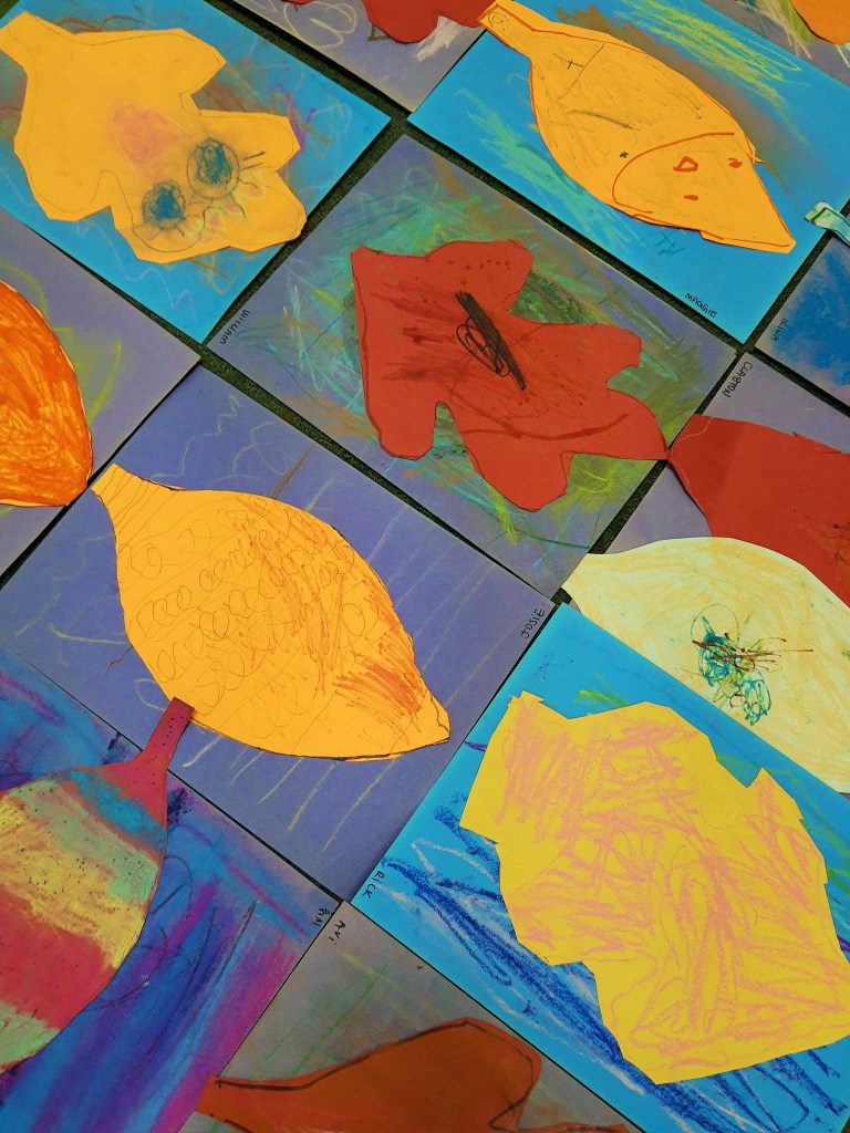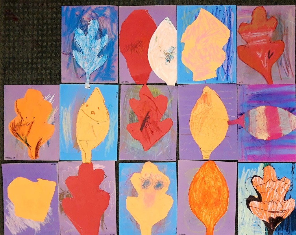 This fall, lower elementary made these lovely fall leaves using chalk pastel and construction paper. Students practiced tracing leaf templates and adding colorful patterns with chalk pastels. Students even experimented with blending and smudging the pastels together.