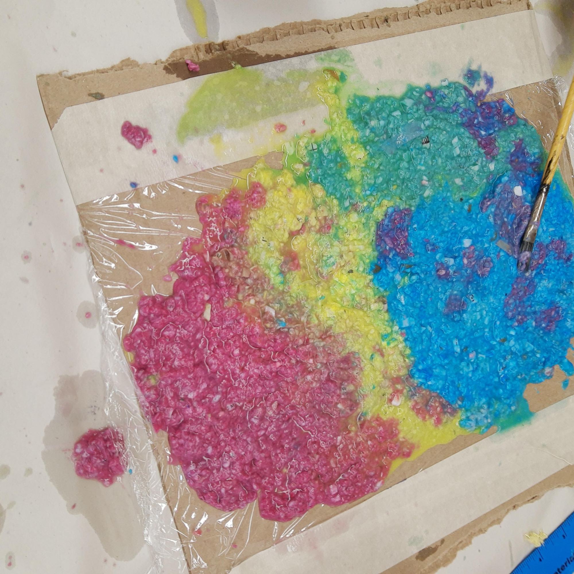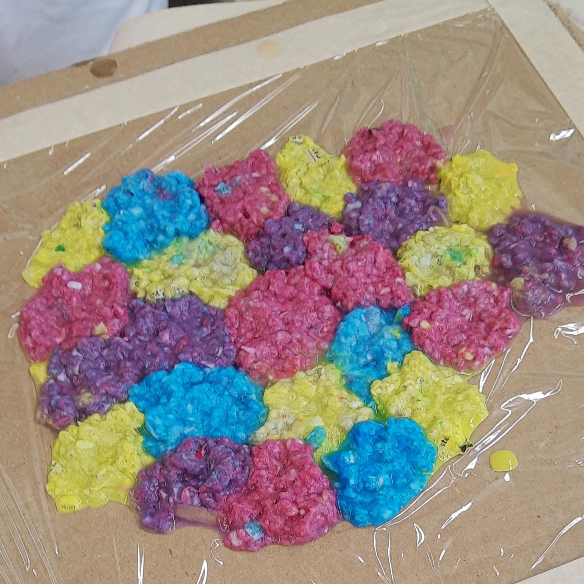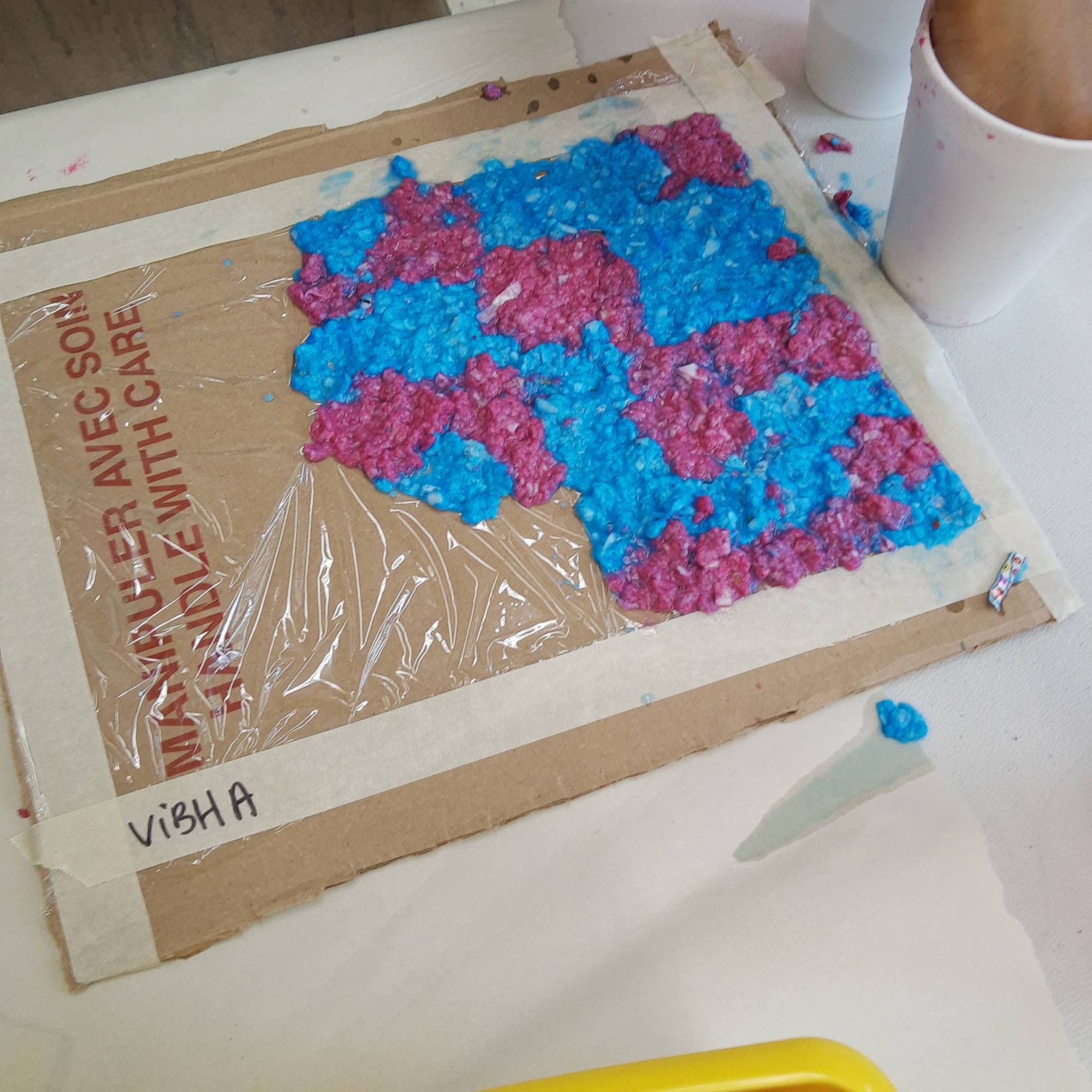 I prepped red, yellow, and blue paper pulp by blending soaked paper scraps and adding acrylic paint to the blender. The main paper pulp was in big tubs and students used smaller cups to scoop up paper pulp to take to their seats. Students created paper pulp designs on top of a piece of cardboard covered in plastic wrap.