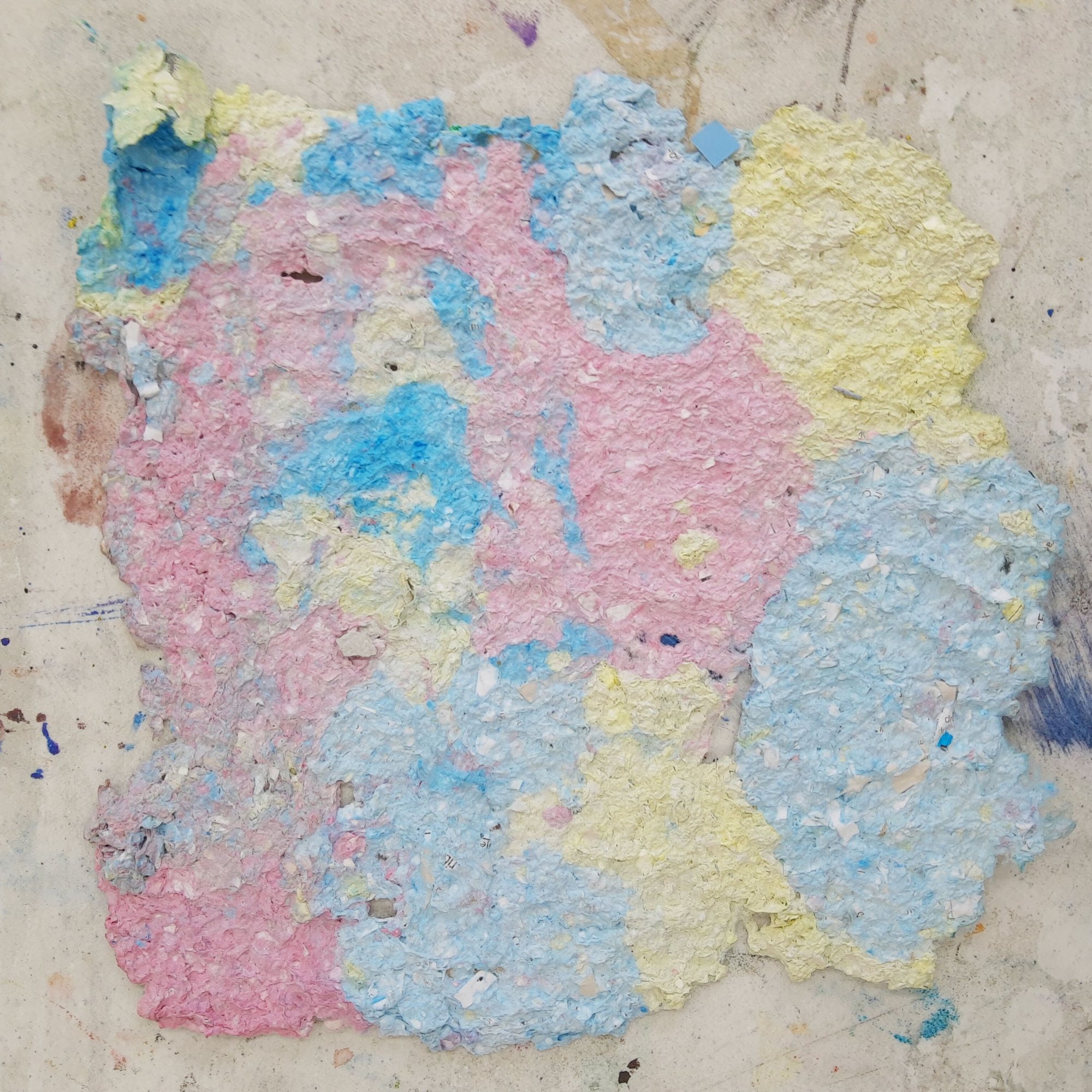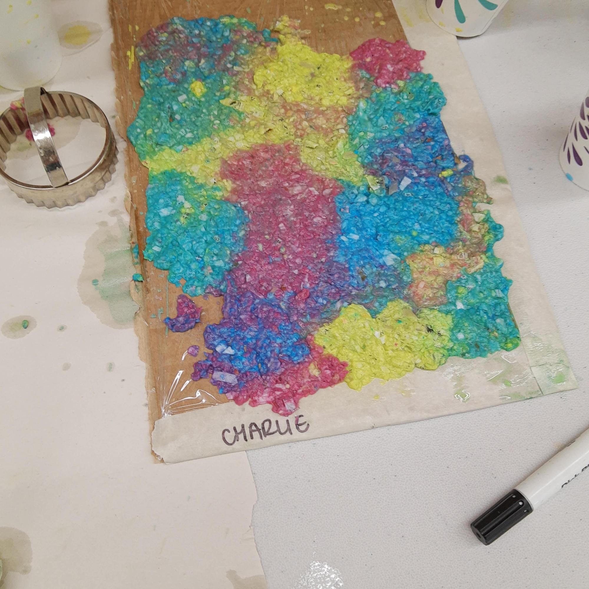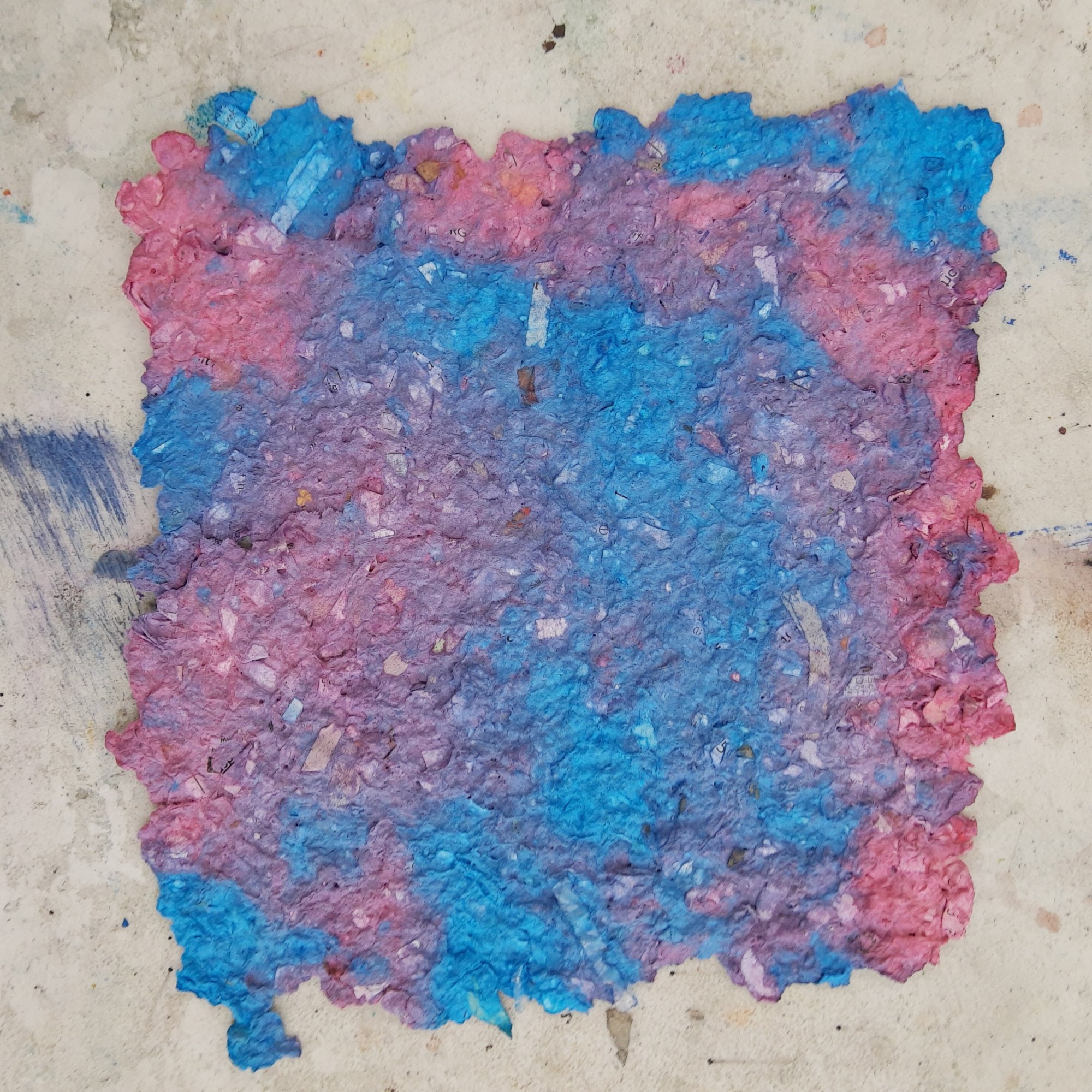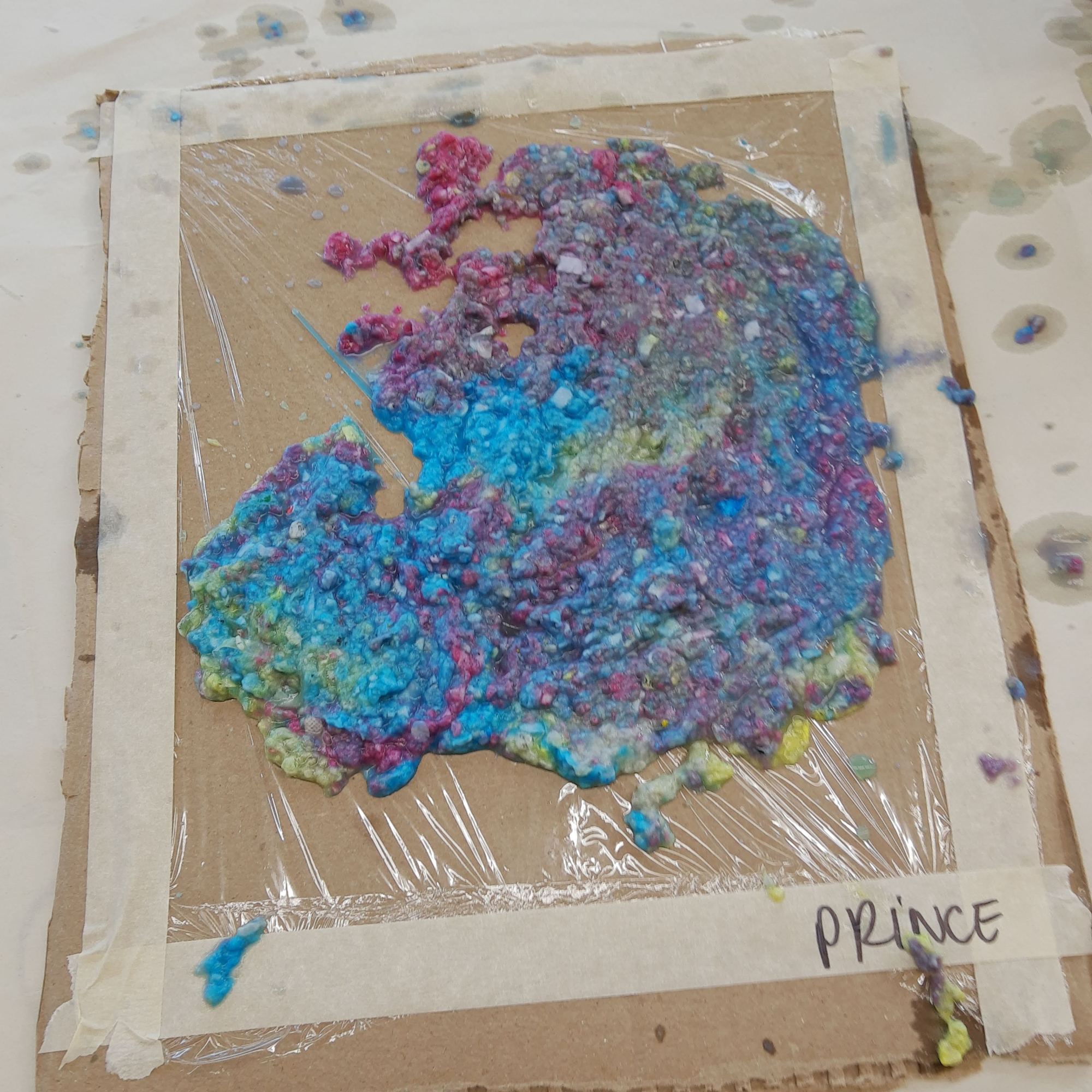 I prepped red, yellow, and blue paper pulp by blending soaked paper scraps and adding acrylic paint to the blender. The main paper pulp was in big tubs and students used smaller cups to scoop up paper pulp to take to their seats. Students created paper pulp designs on top of a piece of cardboard covered in plastic wrap.