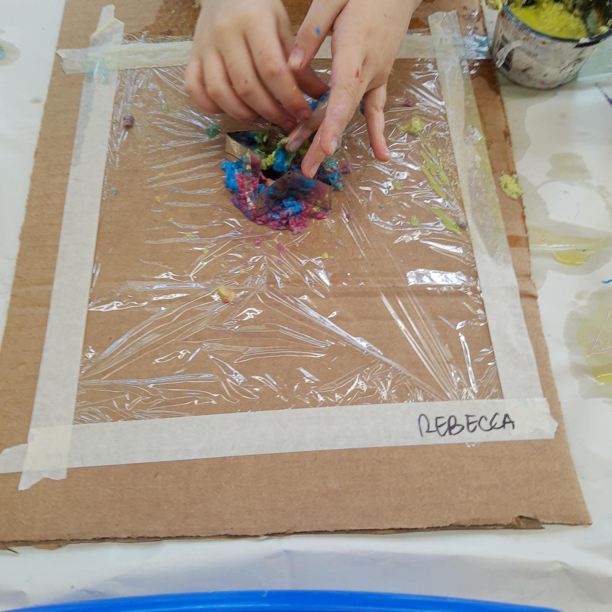 Once we were done printing, I set out tempera paint for campers to create a more finished, detailed collagraph plate. Only a few campers decided to add paint because many of them really liked all the ink colors from printing and did not want to cover it up.