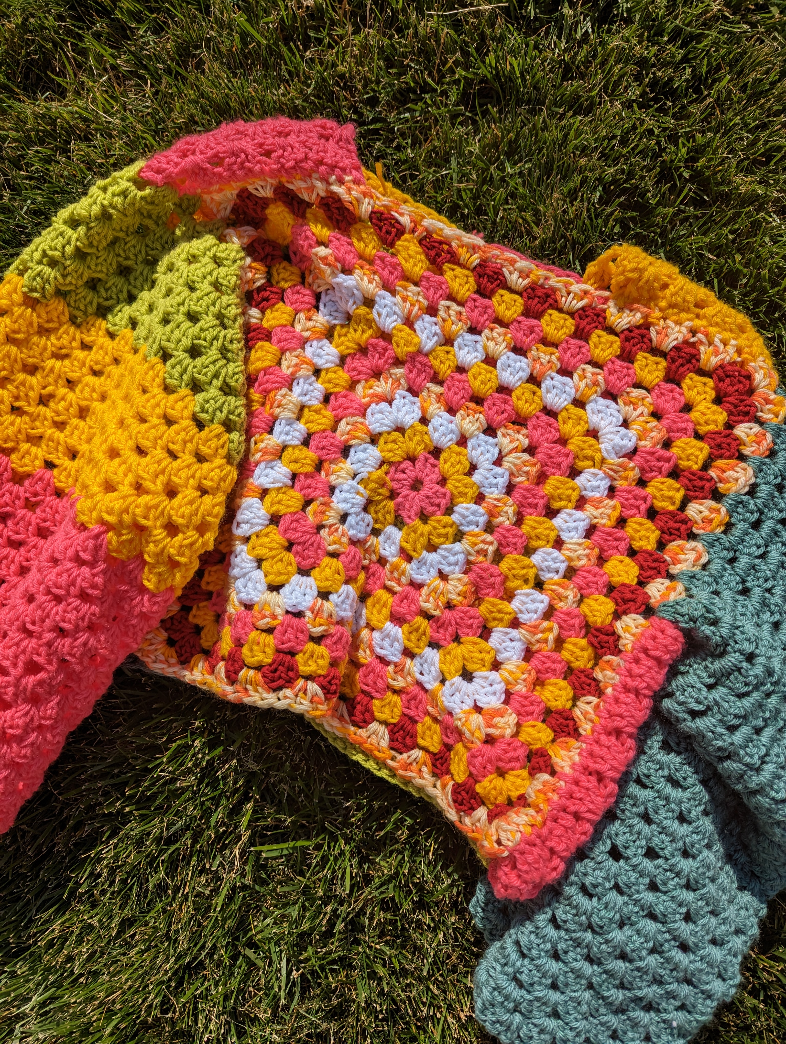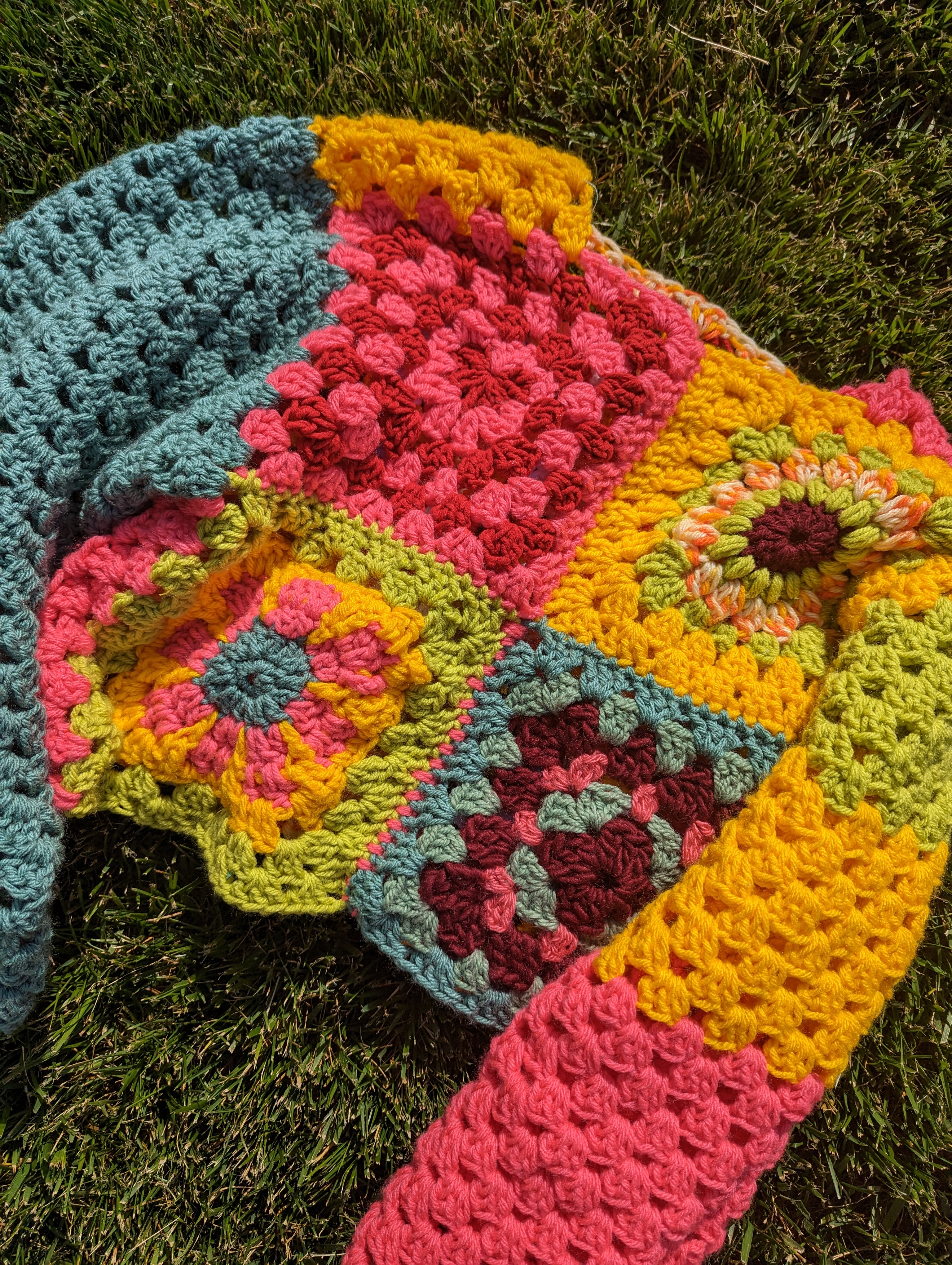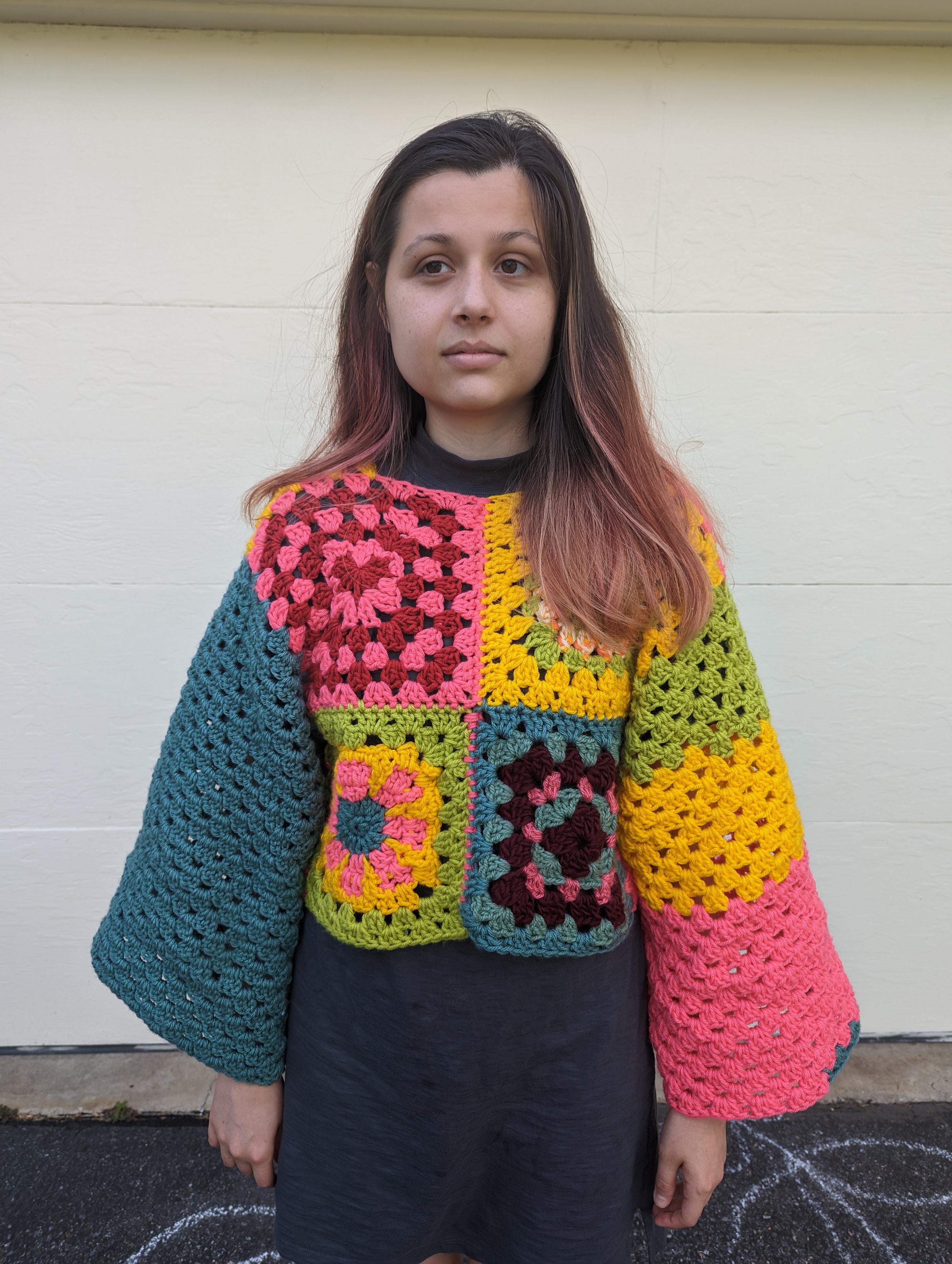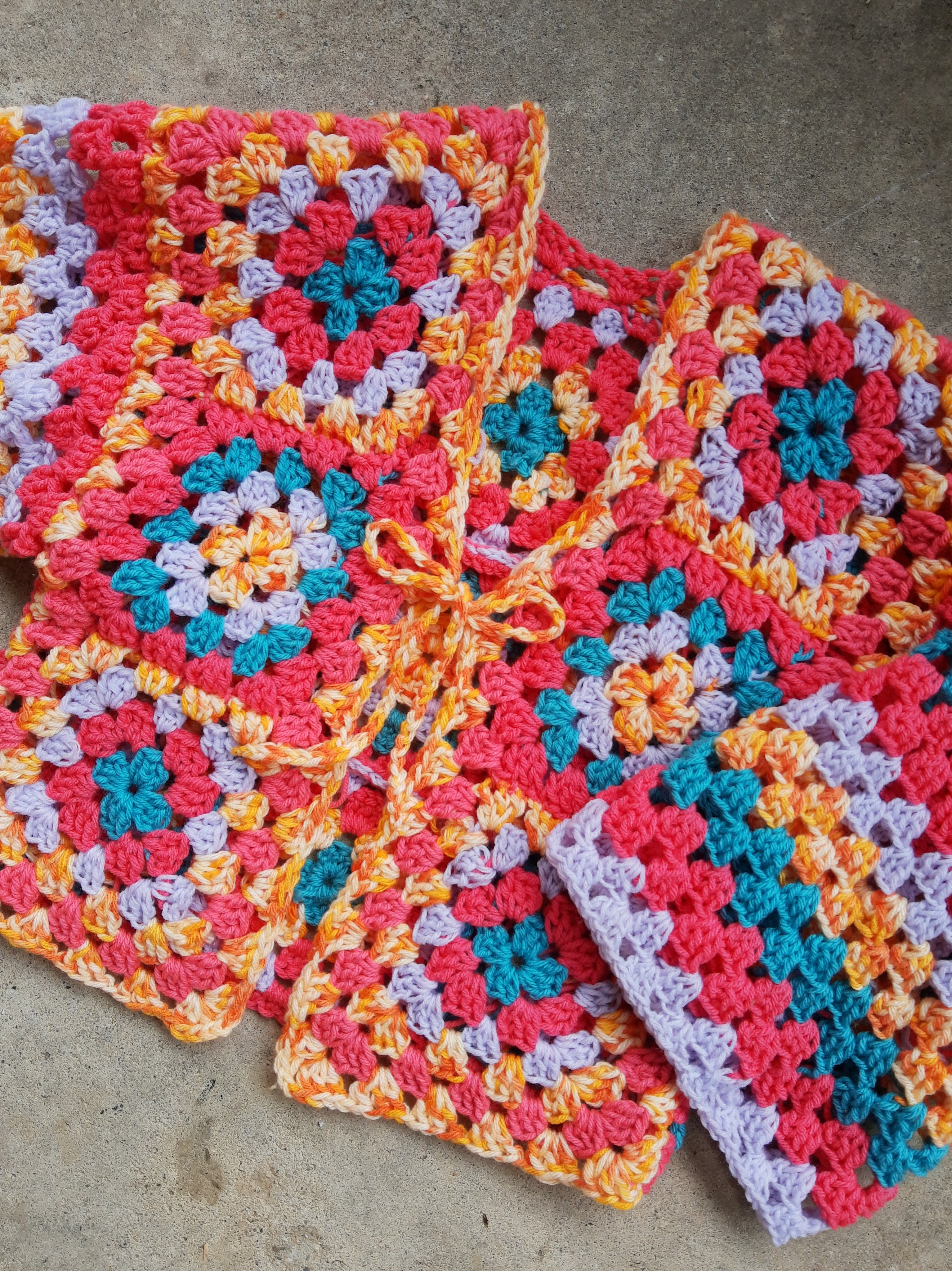 Granny Square Vest (Pattern by HayHayCrochet), Granny Square Bucket Hat, and Purple Cardigan