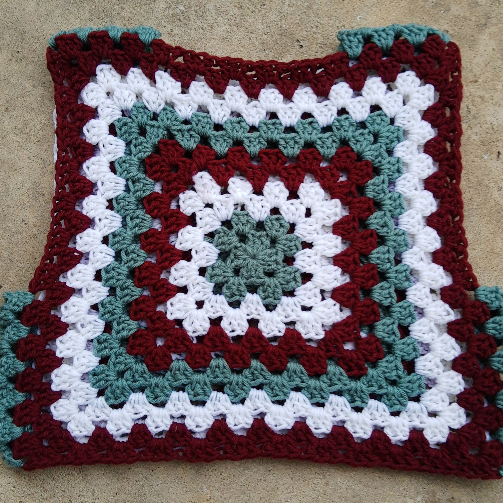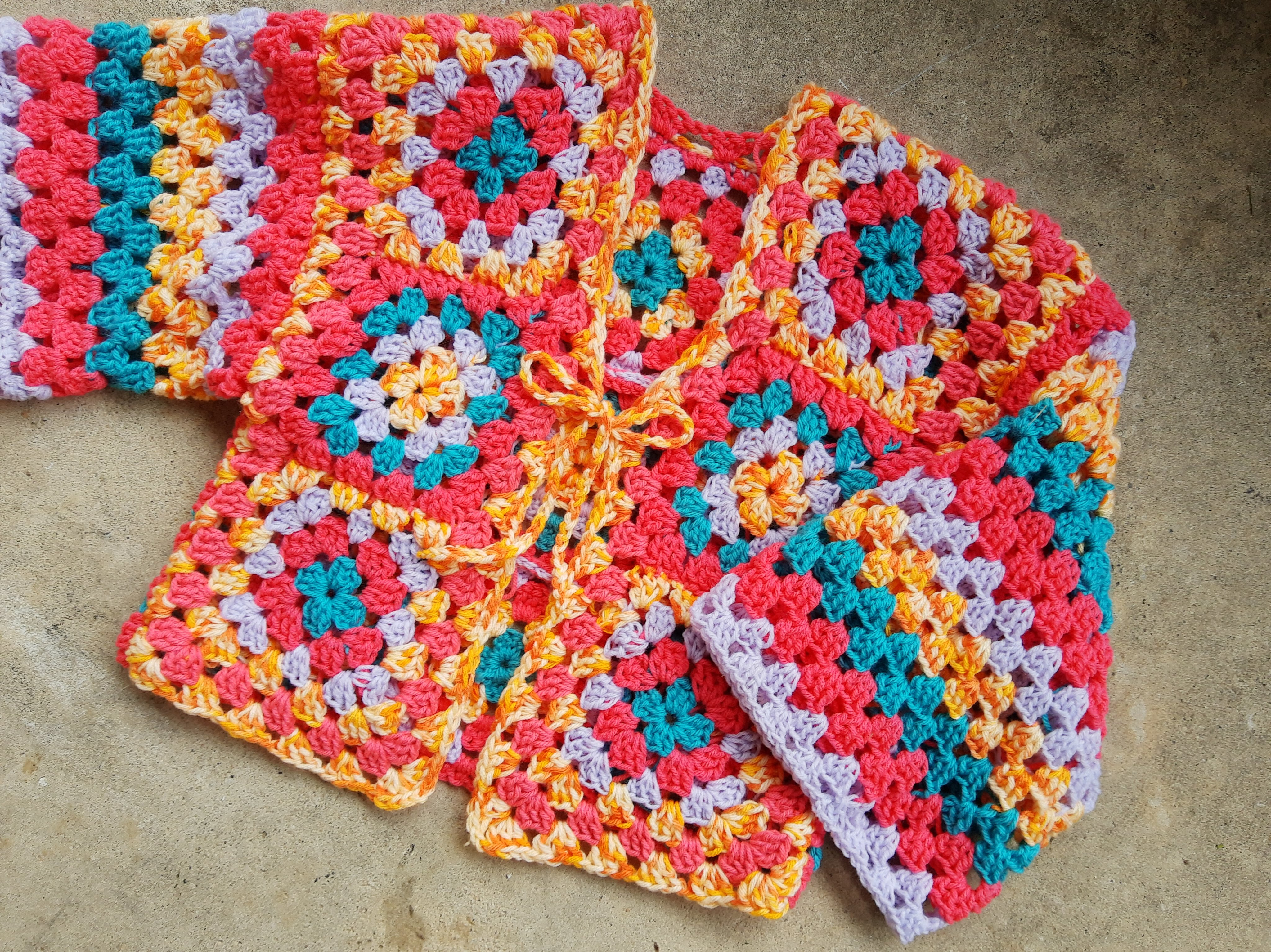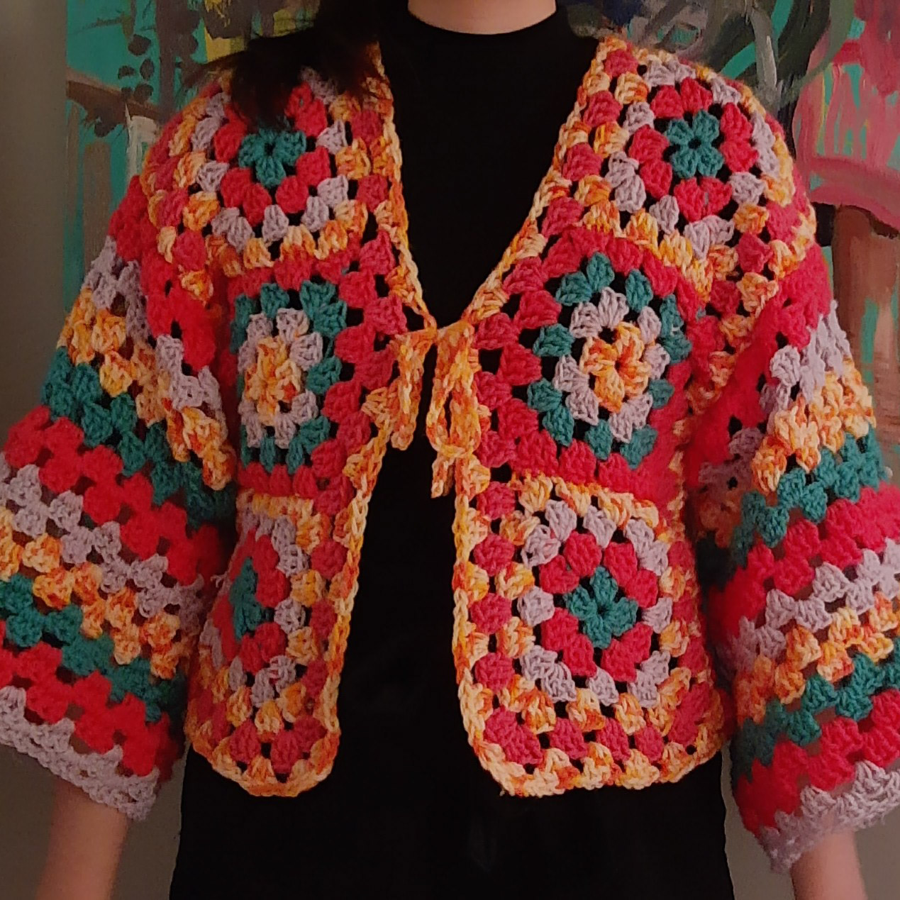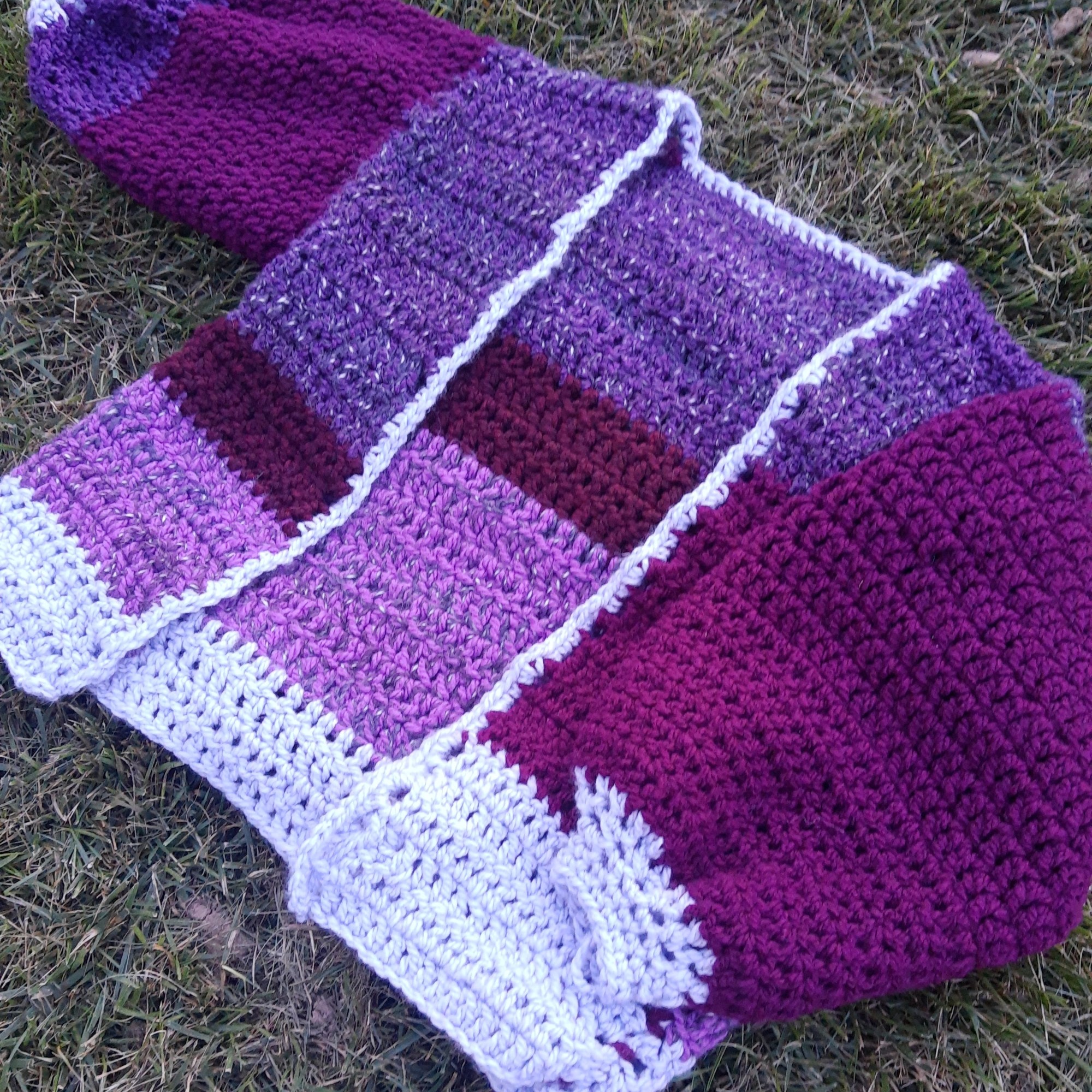 Granny Square Vest (Pattern by HayHayCrochet), Granny Square Bucket Hat, and Purple Cardigan
