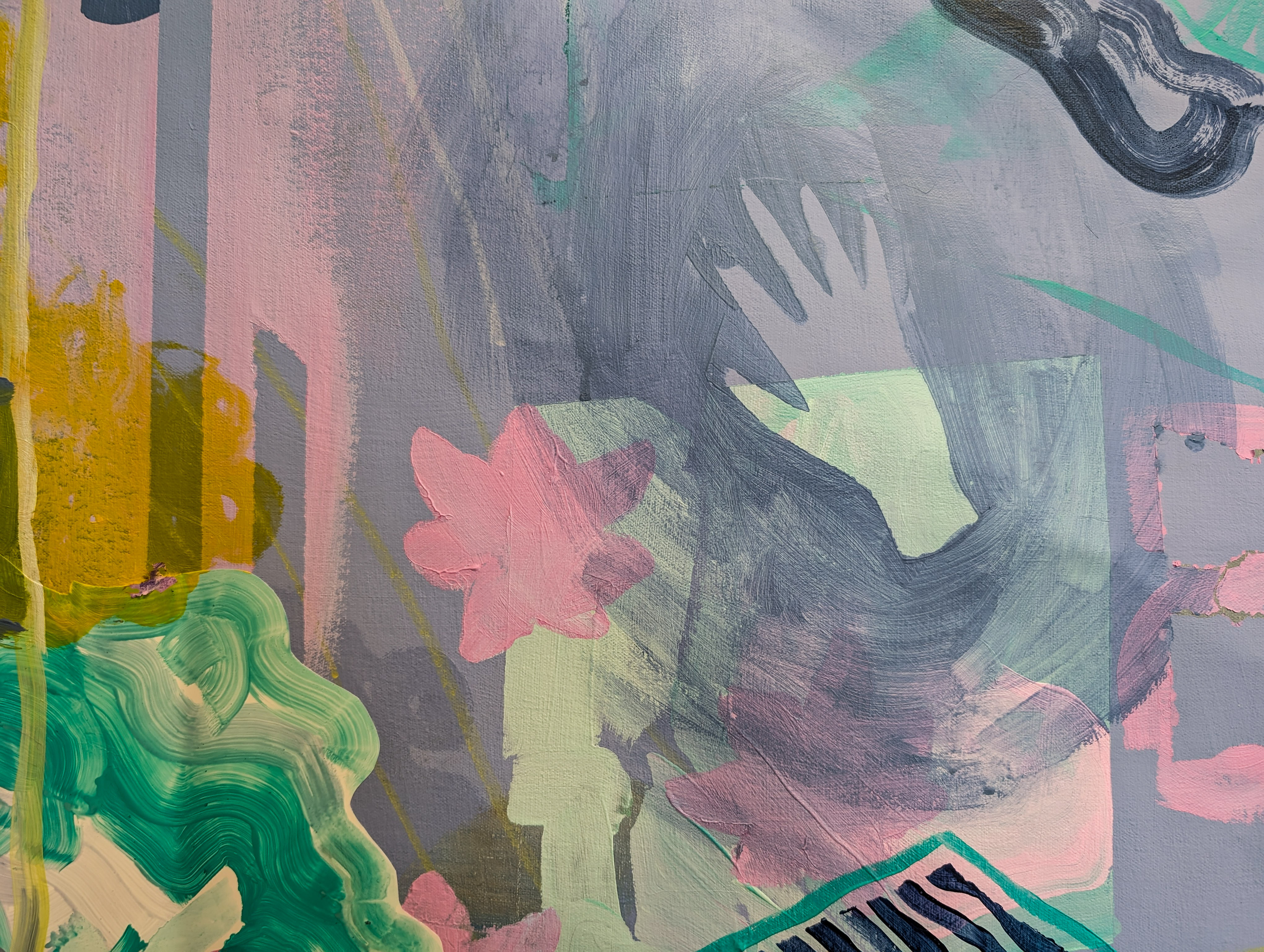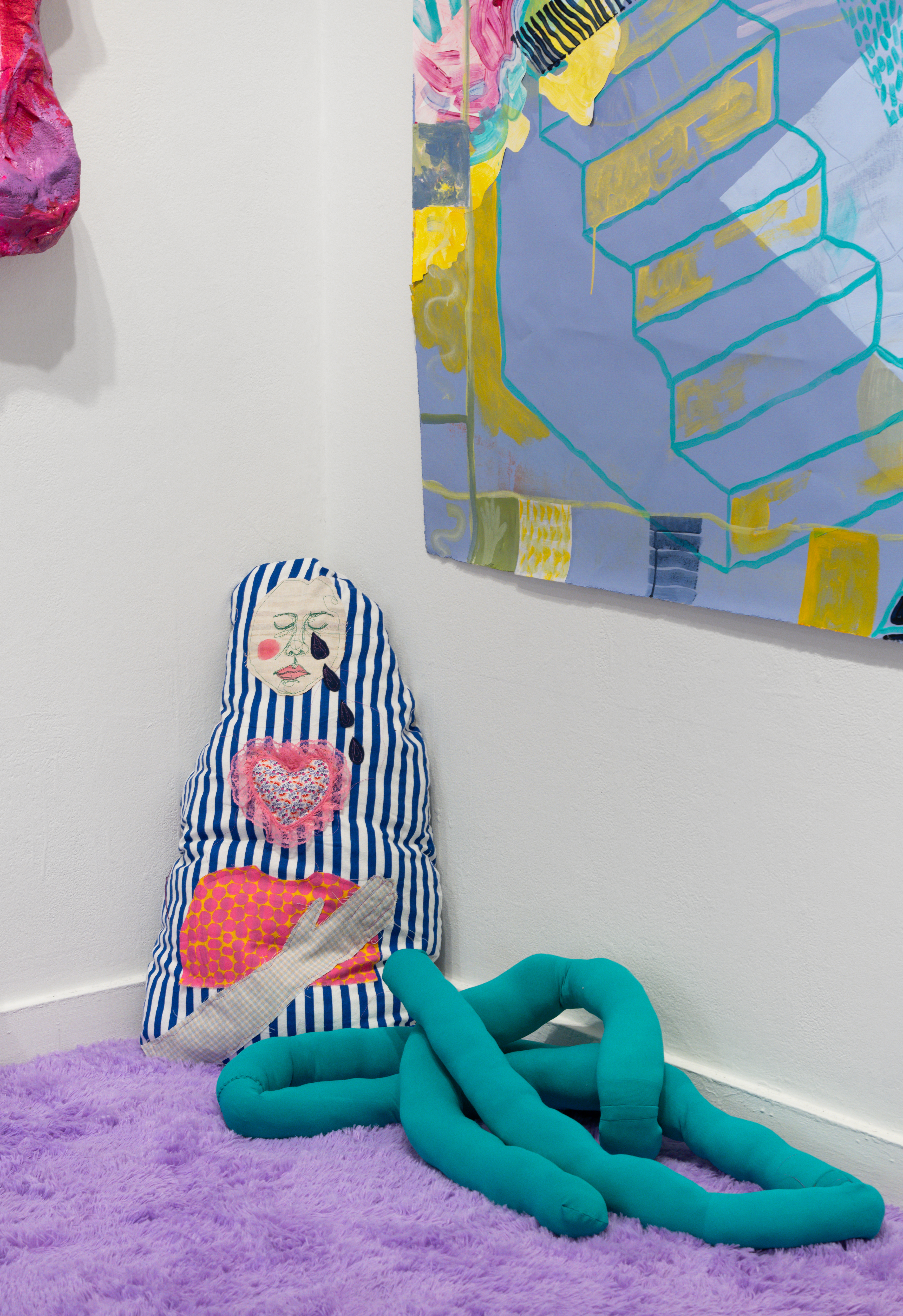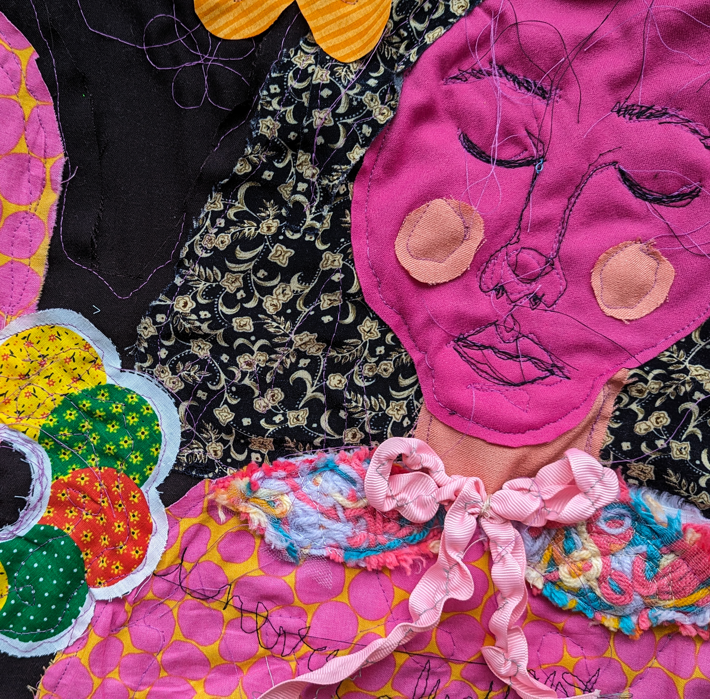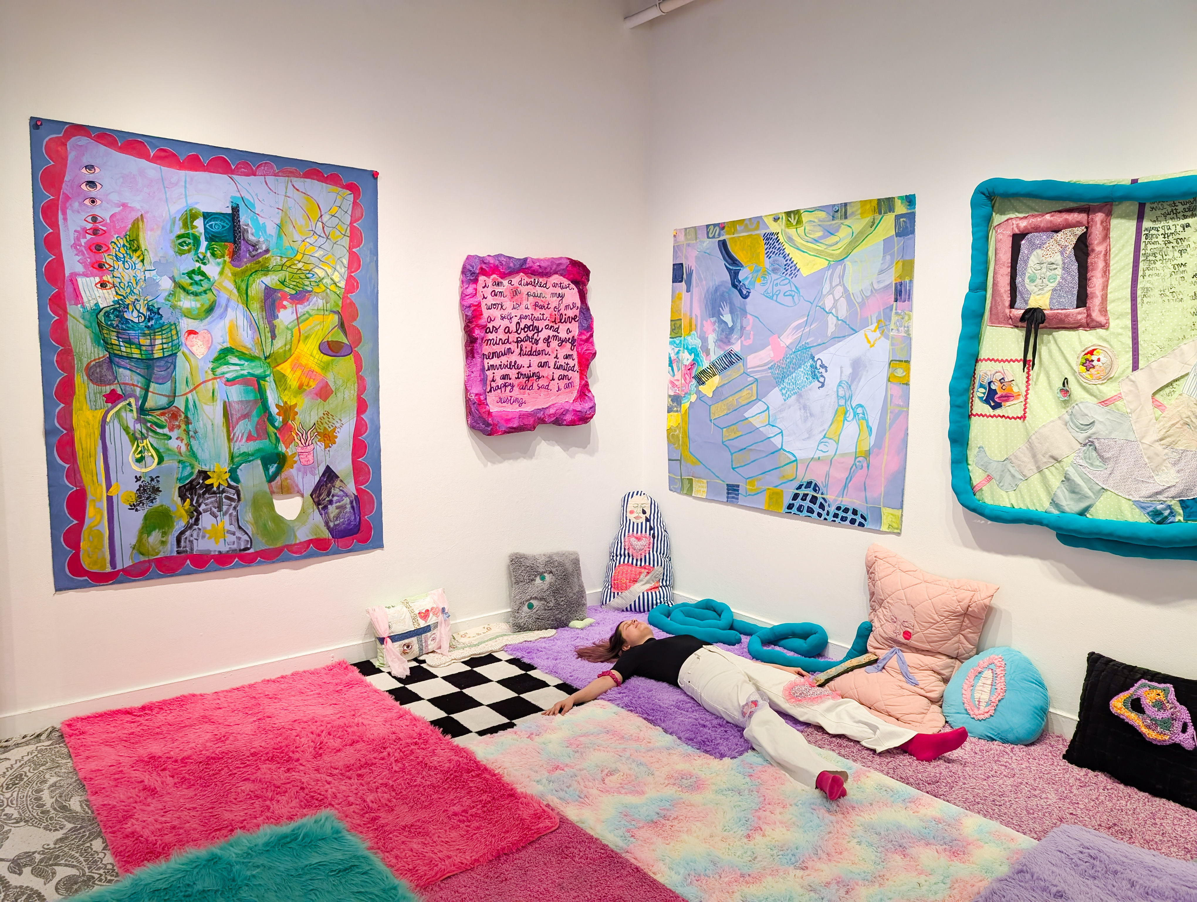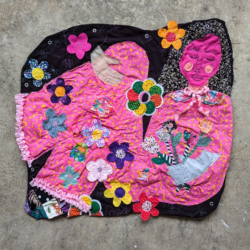 Pain & Relief Images above by Vivian Marie Doering 2 images above and 3 images below by Vivian Marie Doering 2 images above by Vivian Marie Doering Growing Pains, fabric and ribbons and thread and grommets, ~3’x2.5′, 2024 Daylight, acrylic on paper, 2024