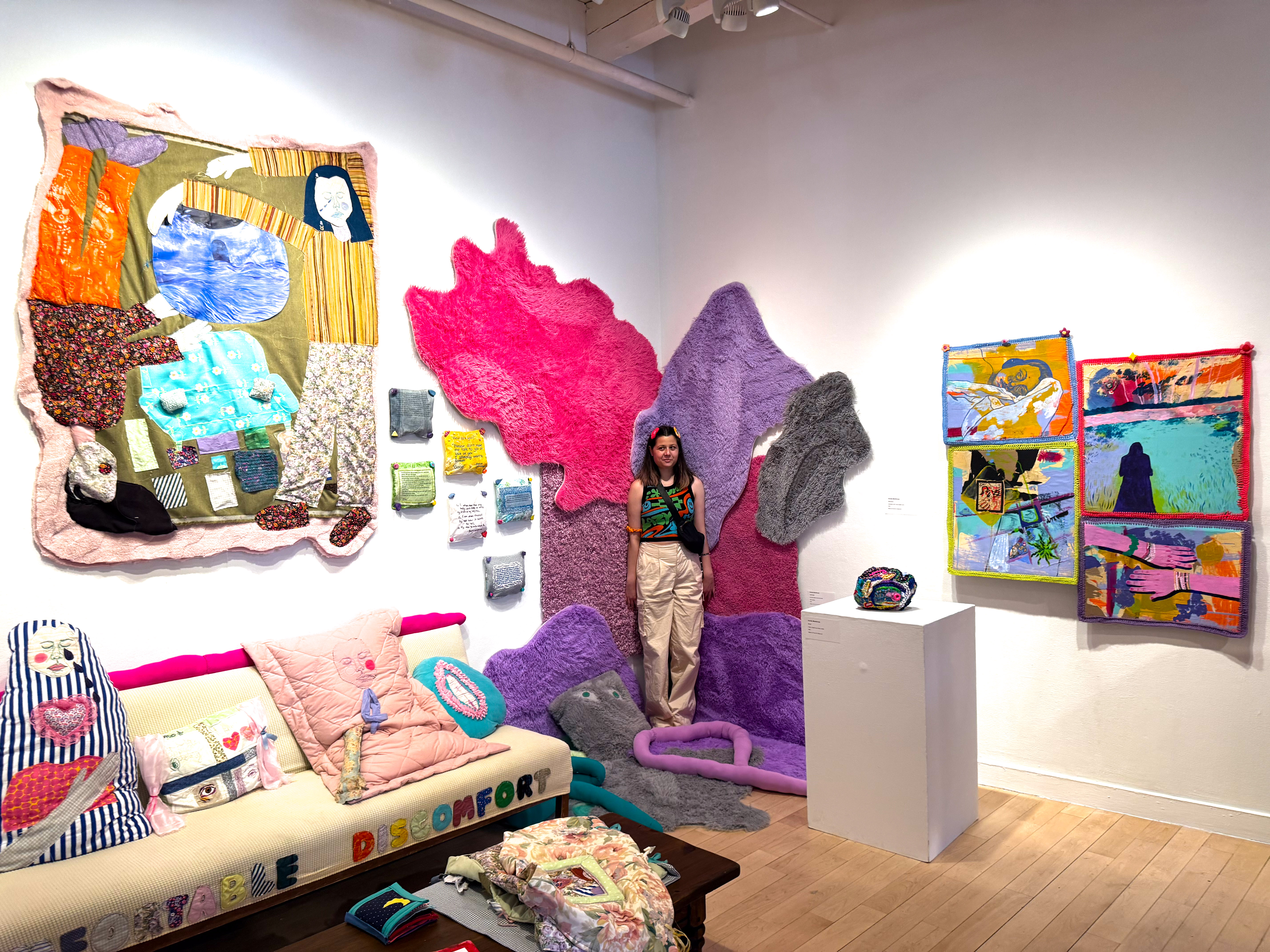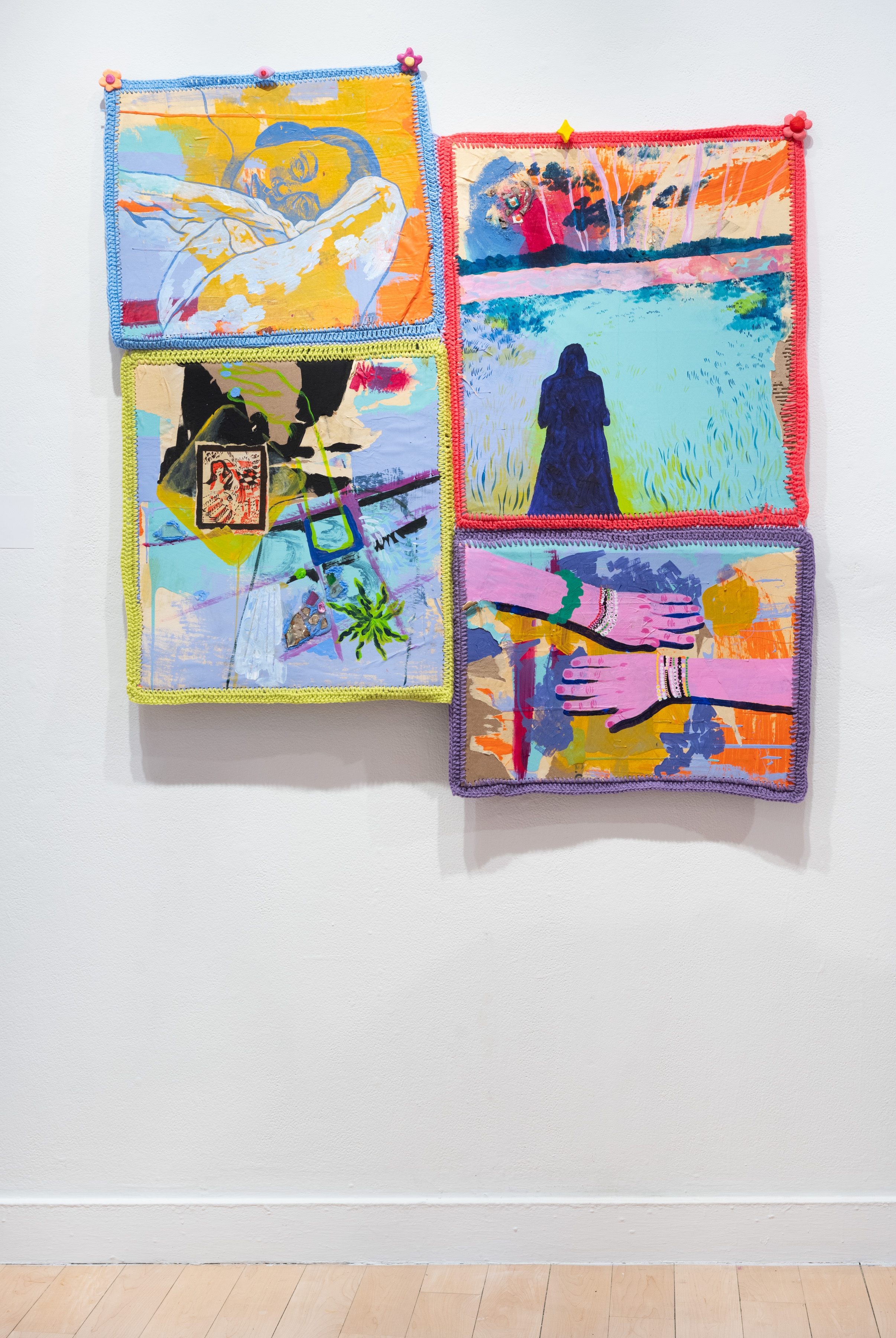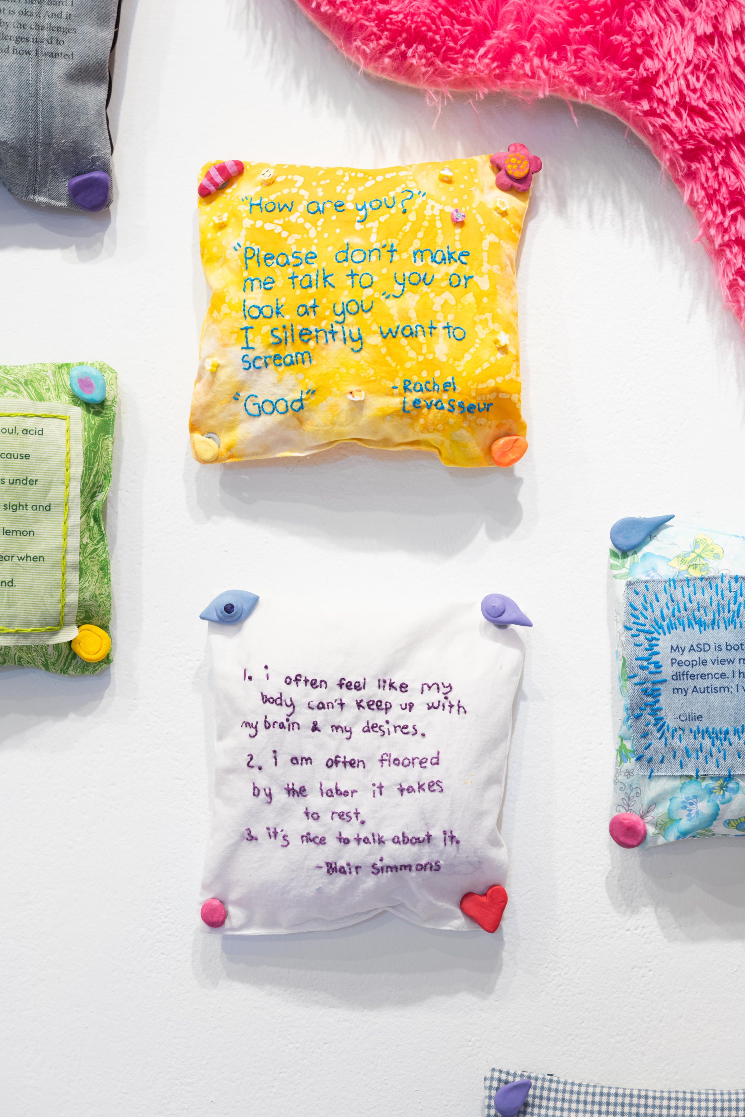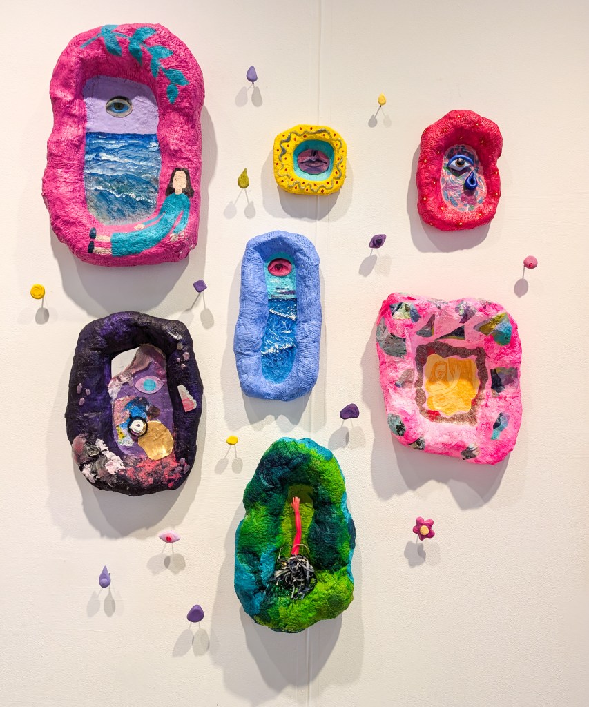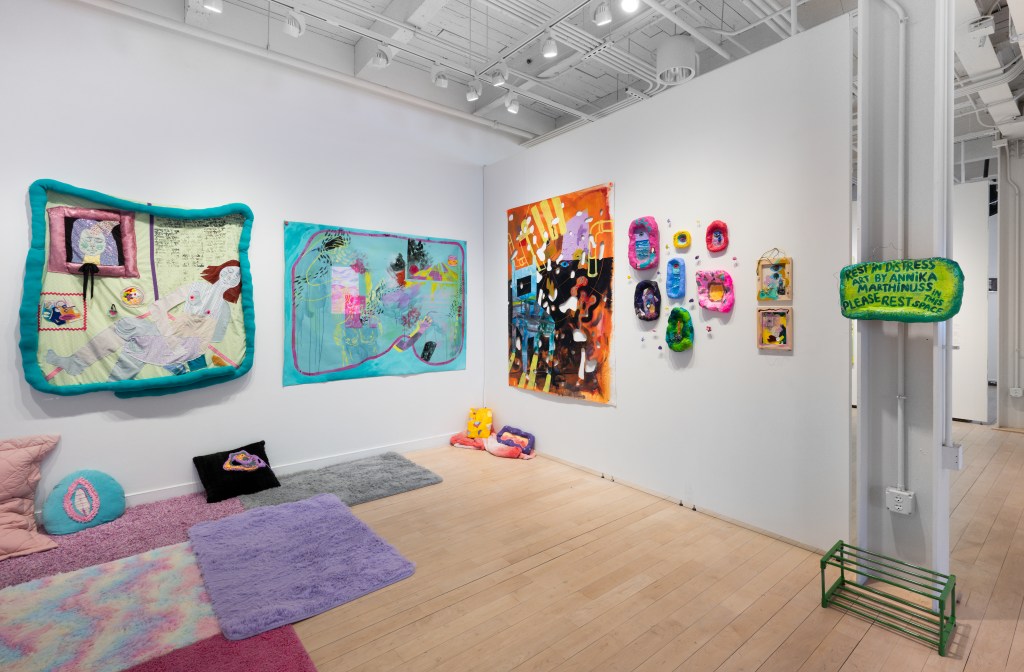 Pain & Relief Images above by Vivian Marie Doering 2 images above and 3 images below by Vivian Marie Doering 2 images above by Vivian Marie Doering Growing Pains, fabric and ribbons and thread and grommets, ~3’x2.5′, 2024 Daylight, acrylic on paper, 2024