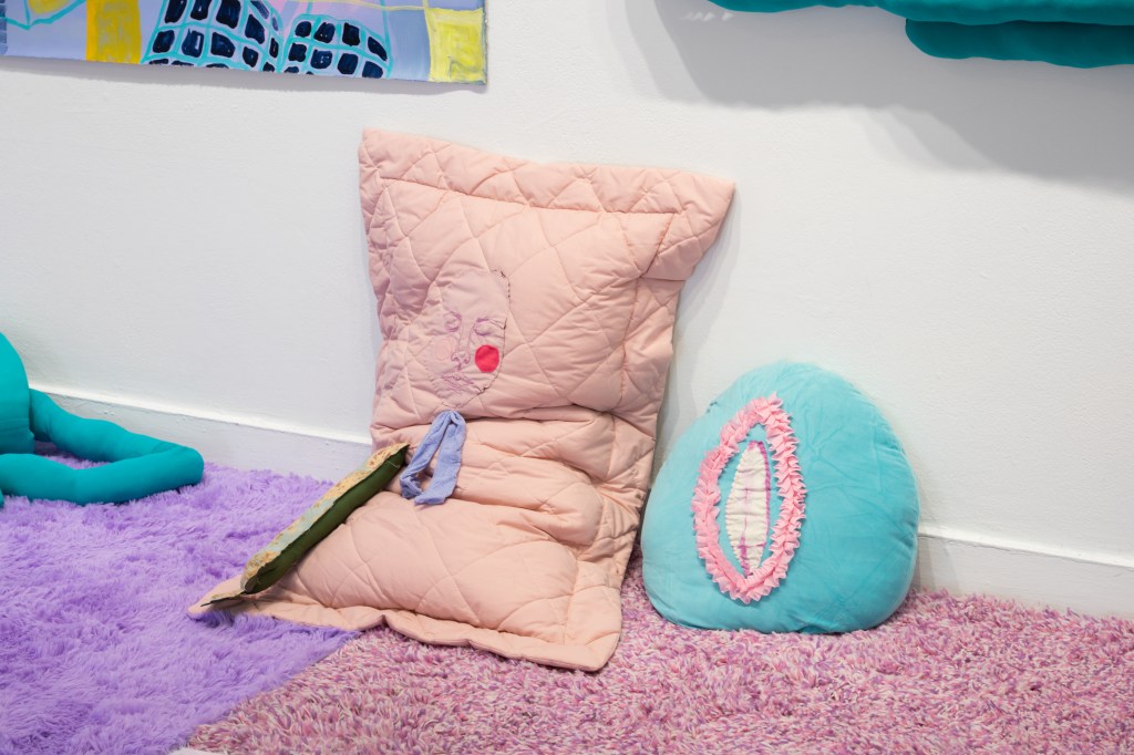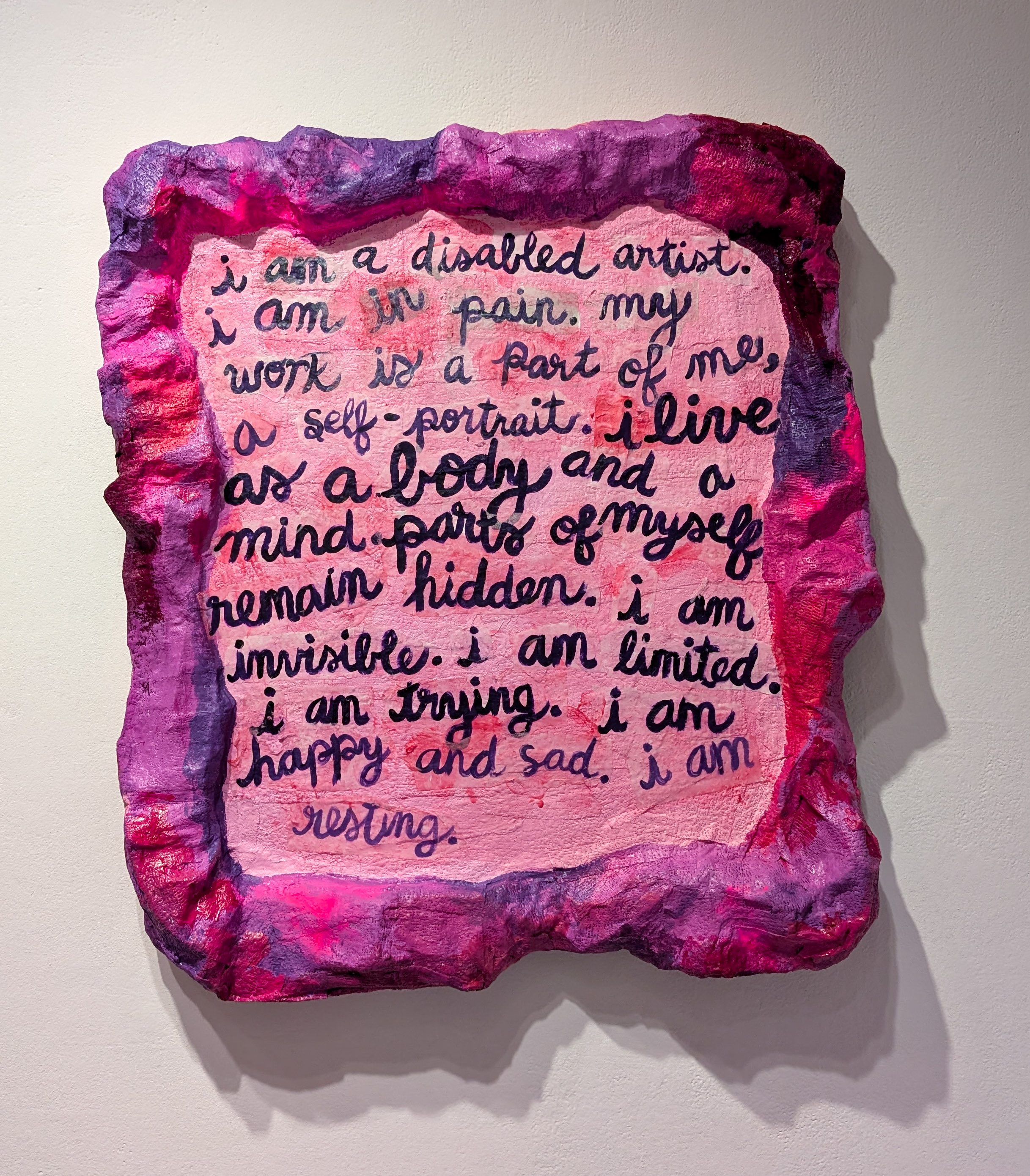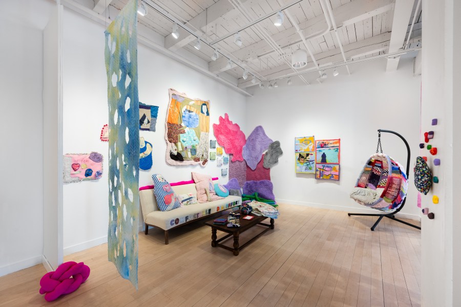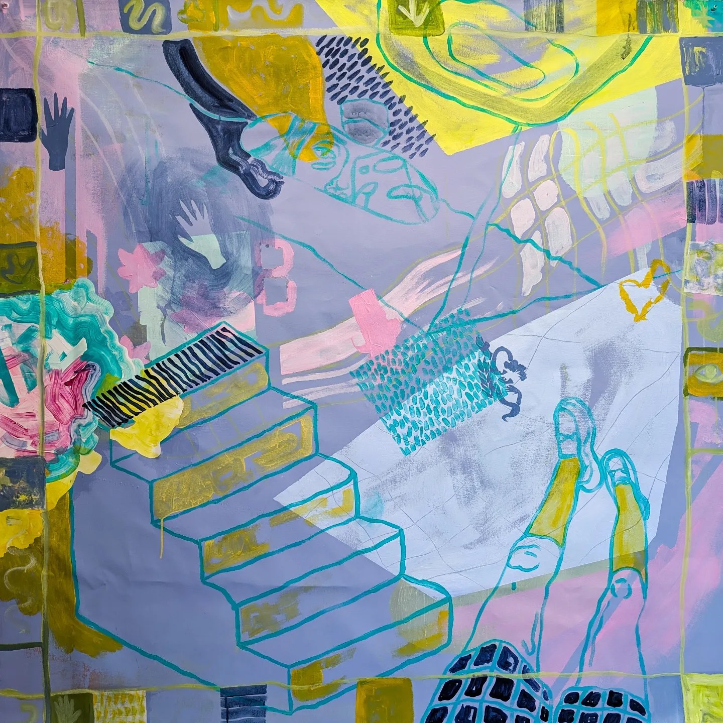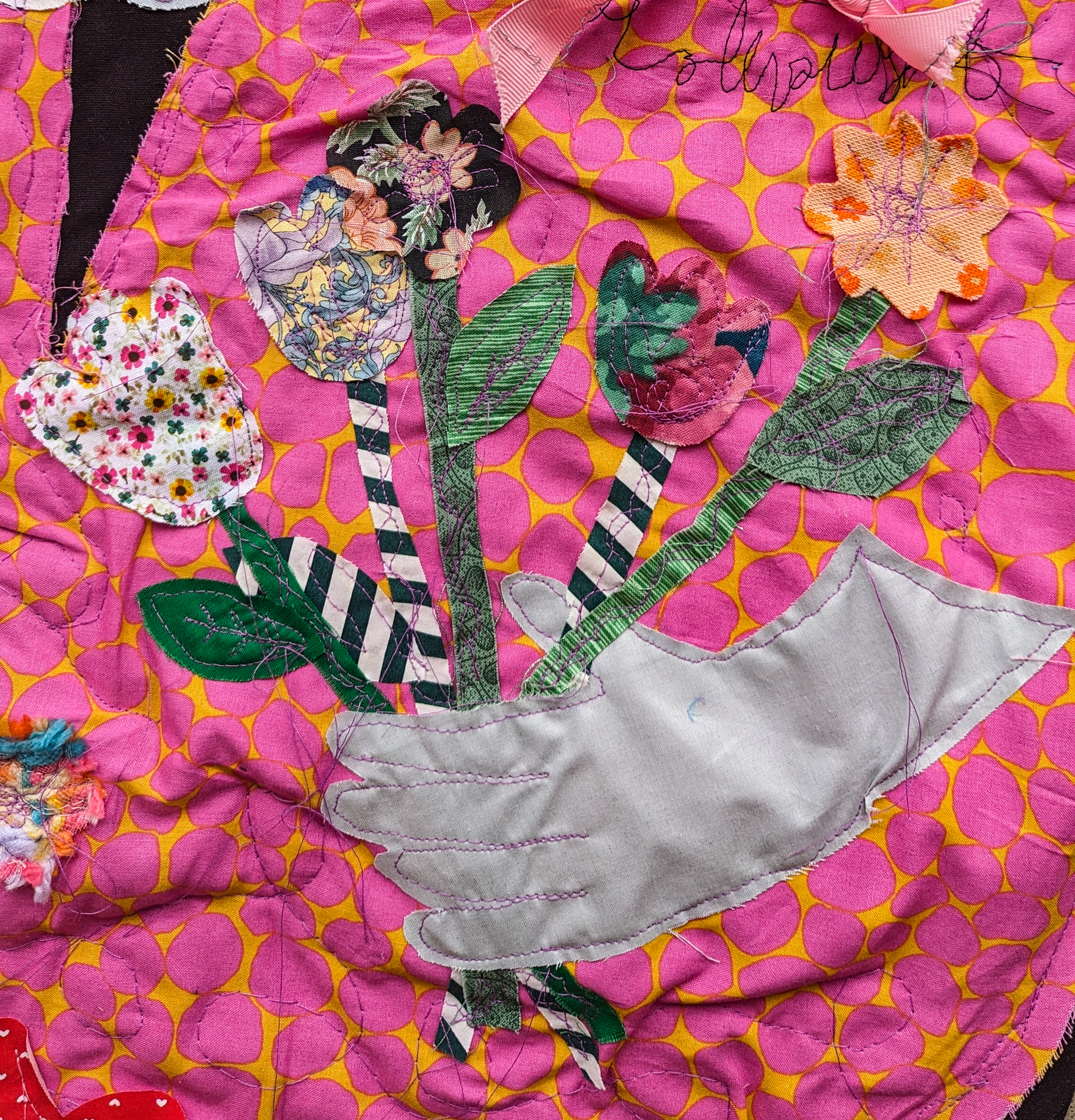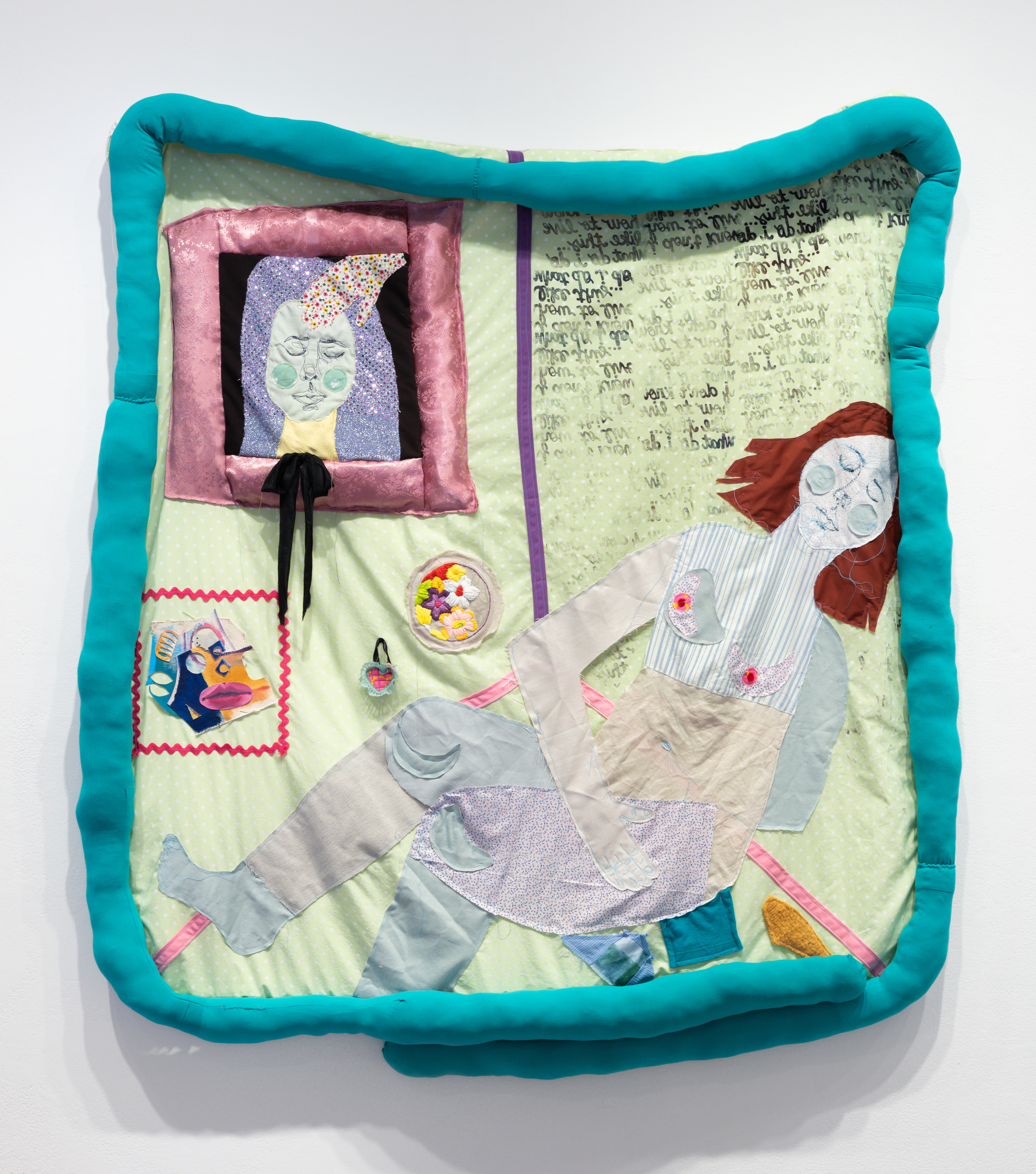 Pain & Relief Images above by Vivian Marie Doering 2 images above and 3 images below by Vivian Marie Doering 2 images above by Vivian Marie Doering Growing Pains, fabric and ribbons and thread and grommets, ~3’x2.5′, 2024 Daylight, acrylic on paper, 2024
