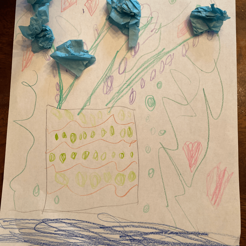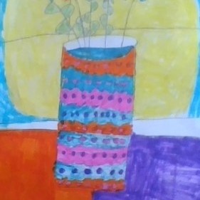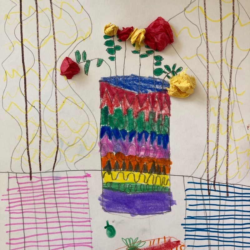 Lower elementary learned about still life art and created their own still life vase with paper crumpled flowers. Again, another lesson I wish I could do in person so we could paint and use tissue paper, but I love how they came out anyways.