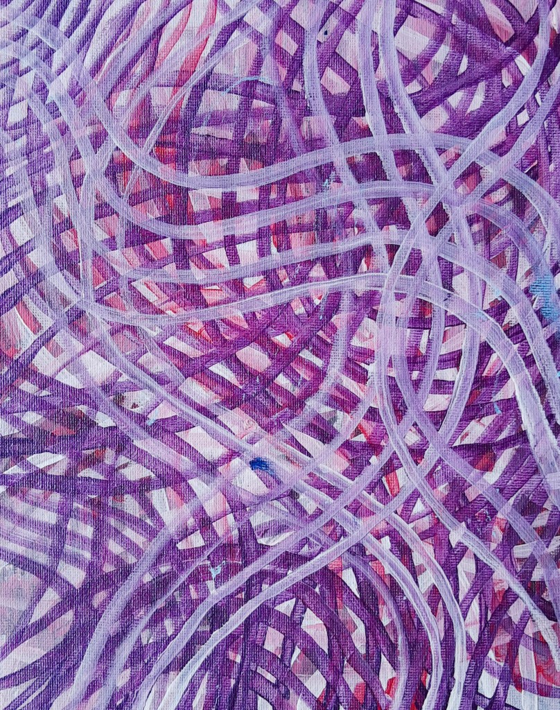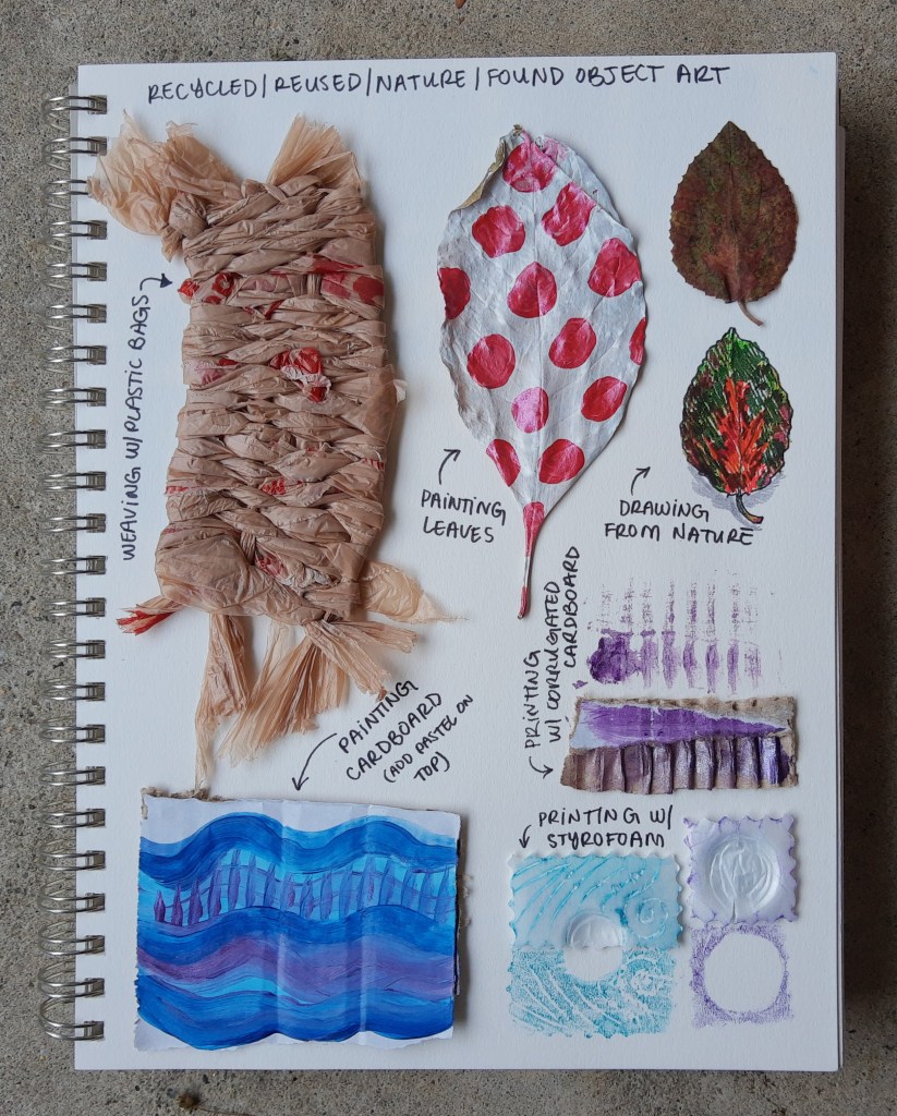 I made samples of different artmaking processes using recycled/found objects (see top left picture). I also created a painting using lines (bottom left picture). In the painting process, I explored letting go and meditative painting.